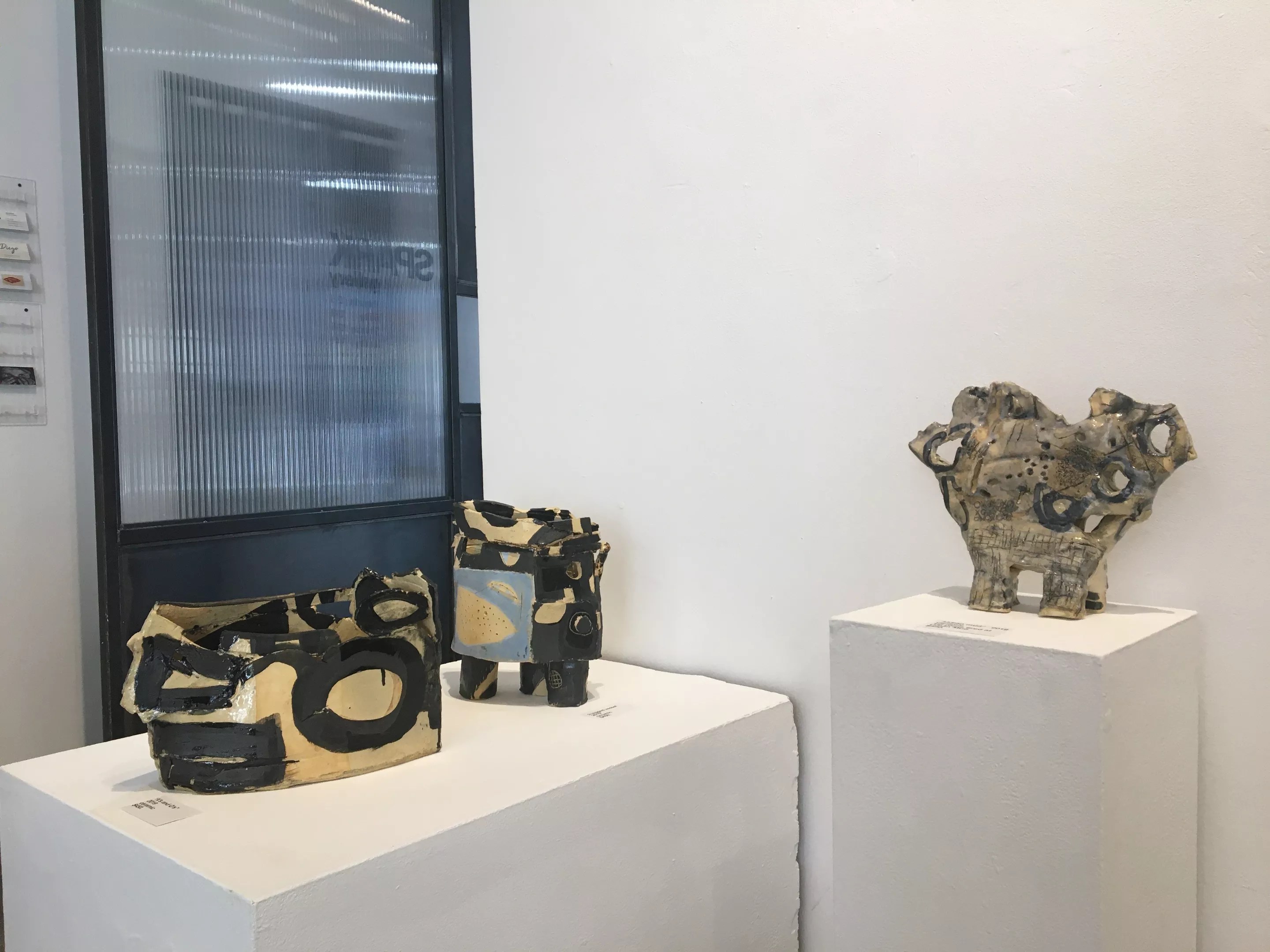 Next door at Spark Gallery, the city’s oldest co-op, abstraction and photography are also on display. Mary Mackey: Mixed Media and Mud fills the east gallery with paintings and ceramics by Mackey, a veteran Denver artist who’s been doing abstract paintings for over 25 years. This show includes a couple of her monumental, automatist compositions carried out in collage and paint, dominated by creams, blacks and grays. They are very elegant and closely related to her large, slab-built ceramic vessels, both through their quiet palettes and Mackey’s expressive approach to mark-making. Mackey opened Urban Mud, a gallery and ceramics workshop, a few blocks south on Santa Fe this summer. Though she’s painted for decades, she took up clay just three years ago, and everything at Spark was created at her studio there.