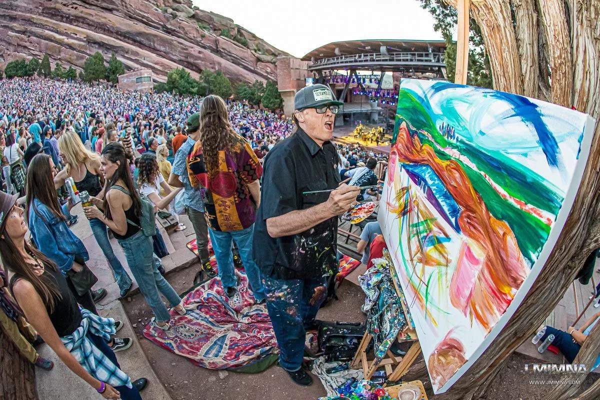 Keith “Scramble” Campbell is an artist-in-residence at Red Rocks Amphitheatre. For the past 22 years, he’s been a mainstay at the venue, documenting its shows through abstract acrylic paintings of the performances. Likening his brushes to an instrument on stage, he takes cues from the musicians around him, harnessing the same improvisational mindset as the jam bands he works with, such as Widespread Panic and the String Cheese Incident.