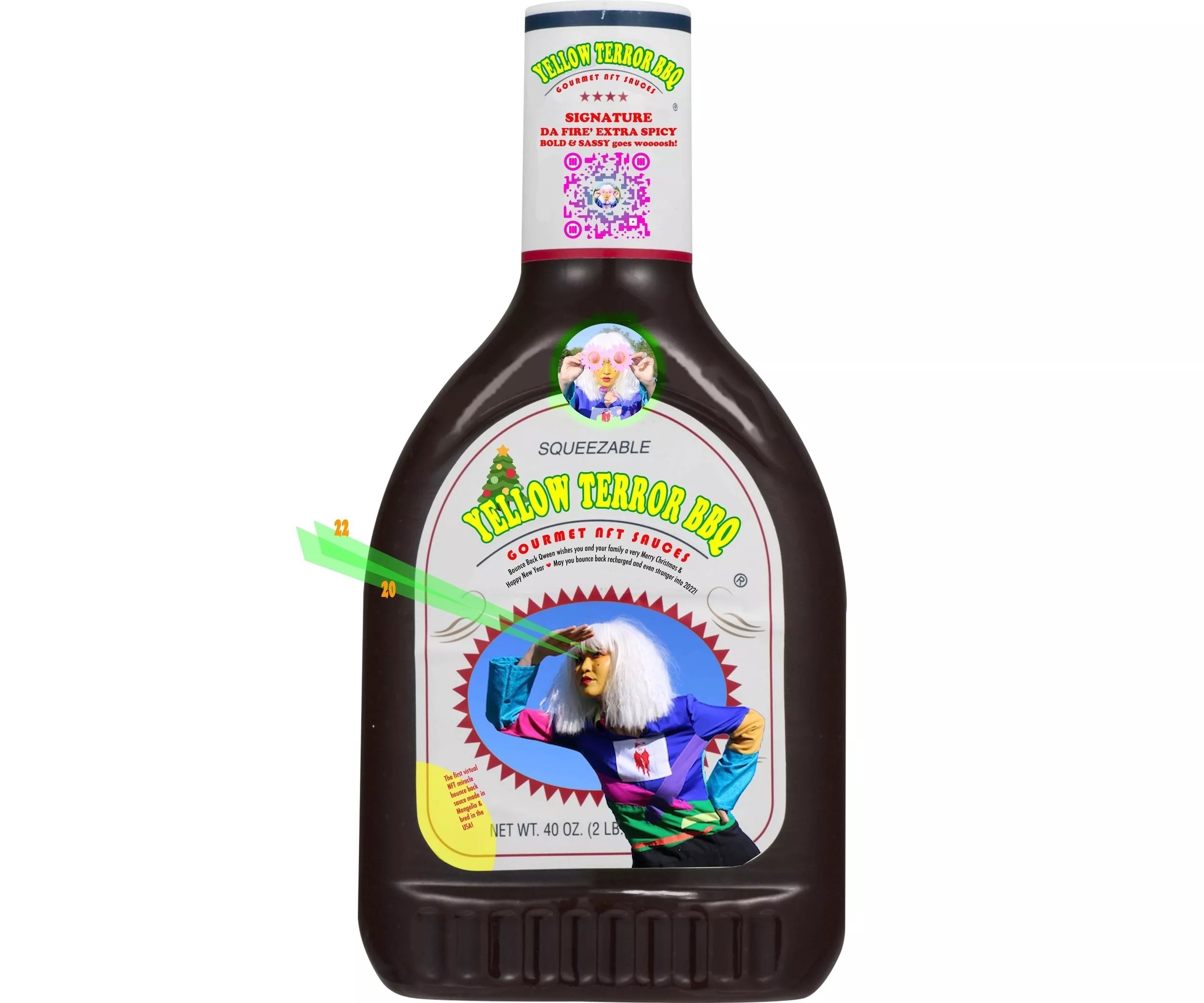 Eriko Tsogo, “Yellow Terror BBQ Gourmet NFT Sauce Signature Da Fire’ Extra Spicy Bold & Sassy goes whoosh!” 2023, barbecue.