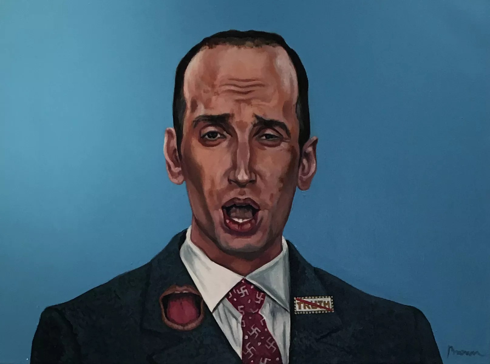 “Ultimately I love to paint, so I’m doing something I love even though I hate the person,” Brown says. She became absorbed in the process and did not overthink the men under her brush. Upon staring into the Trump void, the void did not stare back.
