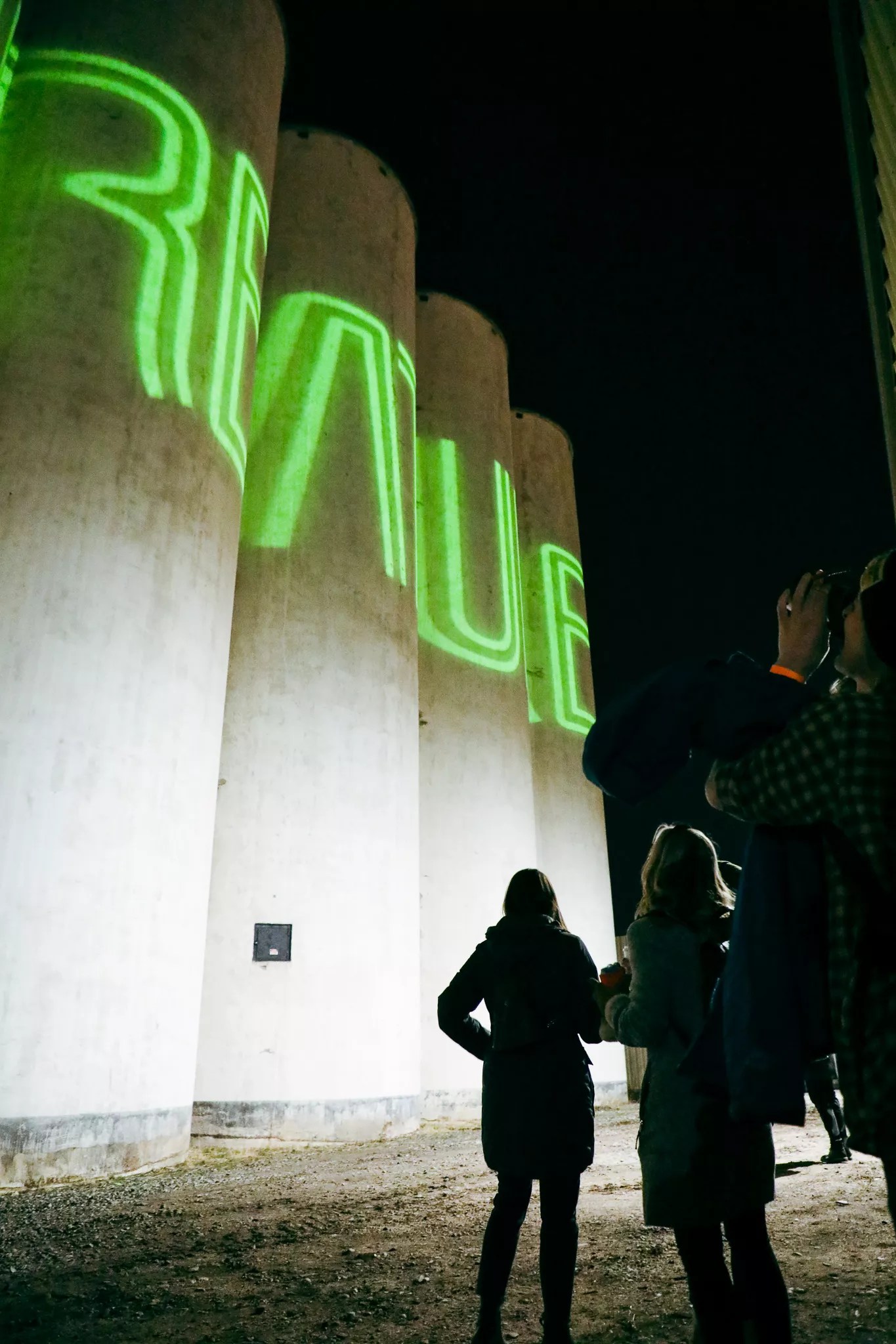 Patrons take in a Side Stories piece projected along the silos in the RiNo Art District