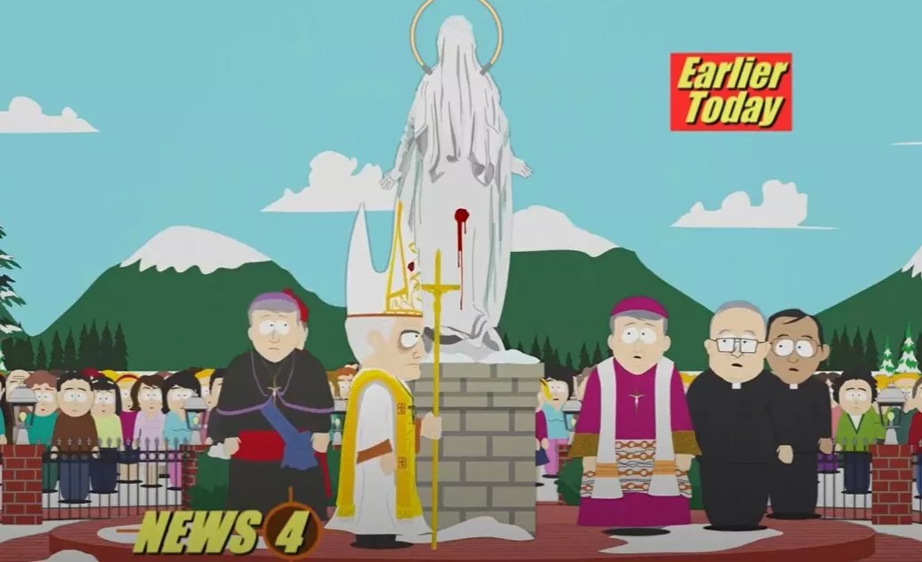“The Poor Kid,” S15, E14 South Park citizens watch the news, which shows the Pope visiting the statue at St. Mary of the Rockies. YouTube