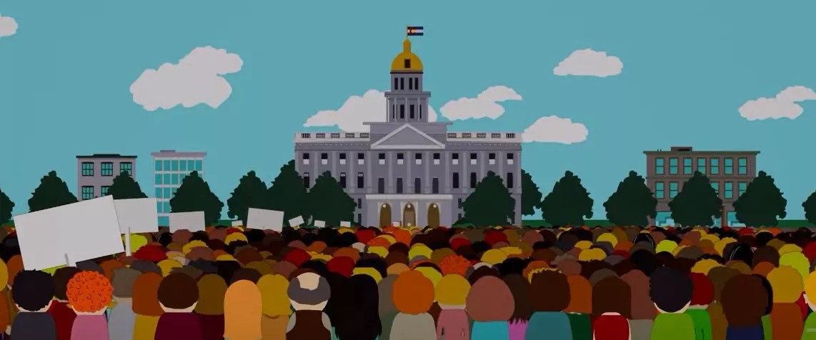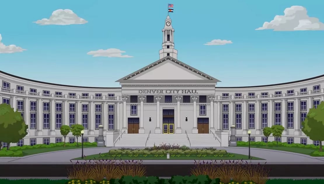 South Park may be the only series that dedicates an episode to comparing queefs and farts, and the debate ends up at the Colorado Capitol in “Eat, Pray, Queef.” But the gold dome is first seen in season six, when Stan, Kyle, Tweek and Cartman form the club “Save Films From Their Directors” after seeing multiple edits of The Empire Strikes Back. They make a poster with the words “Free Hat” to encourage people to join the club, but many people begin showing up because they believe it is a group campaigning to free Hat McCullough, a character who is in prison for killing 23 babies. The McCullough proponents make their way to the Capitol, where they argue that the murderer was acting in self-defense.
