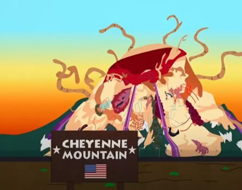 Cheyenne Mountain is a key setting in this episode, in which Cartman is very excited about his “Dawson’s Creek Trapper Keeper Ultra Keeper Futura S 2000,” a new binder whose features include an electronic pencil sharpener, a music player, a flat-screen TV and photos from Dawson’s Creek. A man who attempts to steal the Trapper Keeper (and sleeps with Cartman’s mom) turns out to be a robot from the future sent to destroy Cartman’s binder because it has the ability to wipe out humanity. After the robot breaks into Cartman’s computer and becomes one with Cartman himself, it goes to a secret military base inside Cheyenne Mountain to break into the government’s system. Because the robot looks so much like Cartman, Kyle has a difficult time differentiating between it and Rosie O’Donnell, who has also come to town.