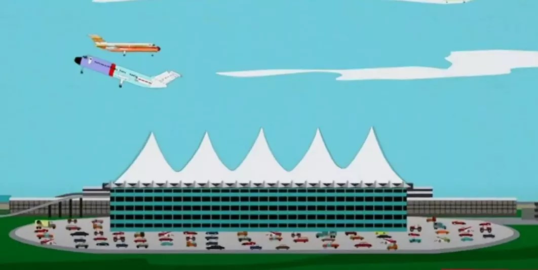 Denver International Airport’s first appearance is in “The Entity.” The episode begins at the airport, where Mr. Garrison is trying to navigate security lines and misses his flight, leading him to rail about a $15 billion bailout taxpayers provided for airlines. He decides to create his own homoerotic device called “IT” that “beats dealing with airline companies,” despite the multiple penetrations required to operate it.