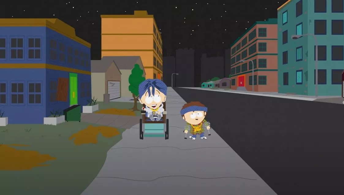 Jimmy and Timmy (the inclusive characters added to South Park before such things were necessary in order for shows to be picked up) create a club for disabled kids called the Crips, but realize there already is such a group. The two make their way to Five Points to meet the gang, and join it after unwittingly blowing up a gas station where the rival Bloods are hanging out.
