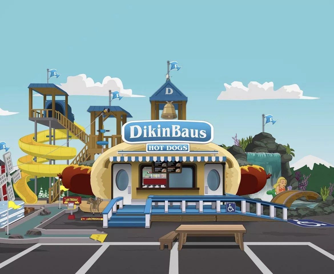 So Parker and Stone were likely drawing from lived experience in the episode “DikinBaus Hot Dogs,” in which Cartman decides to rehab his new home — a hot dog-shaped shop whose sign reads “Coney Island Hot Dogs” but which looks identical to Bailey’s Coney Island Boardwalk hot dog stand — into DikinBaus Hot Dogs, a restaurant that not only serves hot dogs with balls drawn in ketchup on the plate, but is an entertainment spectacle, with such features as rides, games and a grotto (again, sound familiar?).