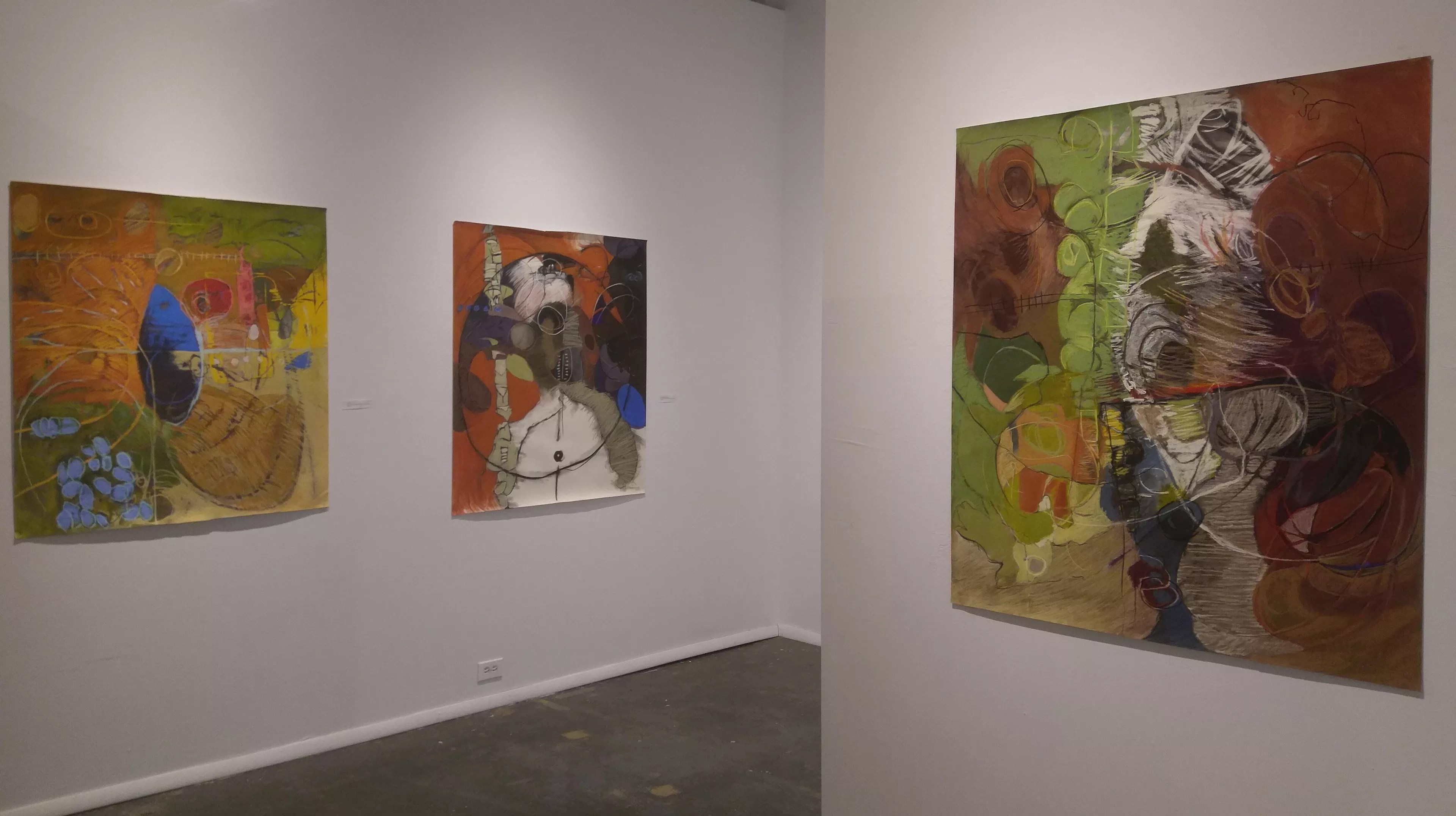 Mark Brasuell has remade the space in the east gallery, using the movable walls to turn it into something of a maze that viewers must navigate in order to see Mark Brasuell: (In) Particulate. Pinned to the walls are monumental drawings – some of them very monumental – done with pastels formulated and made by Brasuell himself. Though he’s been creating enormous drawings for many years, these struck me as different; the saturation of the colors makes them seem like a link between Brasuell’s charcoals and his better-known paintings.