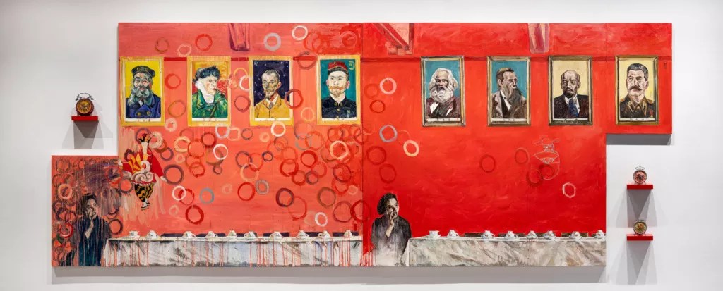 Hung Liu, “Modern Time,†2005, oil on canvas with lacquered wood, cultural revolution clocks. (C) Hung Liu Estate/Artist Rights Society (ARS), New York