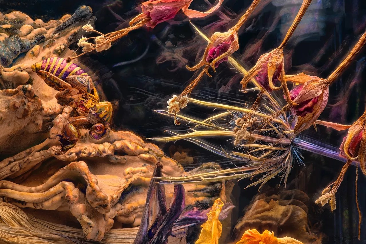 At Walker Fine Art, five artists mine landscapes and pristine nature in Nomadic Daydreams, a show that restores our place in the world to its prehistoric beginnings. But those subjects might be expressed in ultra-modern terms: Bonny Lhotka has added digital tweaking and the use of refractive materials to her toolbox, while mountain man George Kozmon layers mountain landscapes and topo maps, conveying the imagery in temporal shifts.