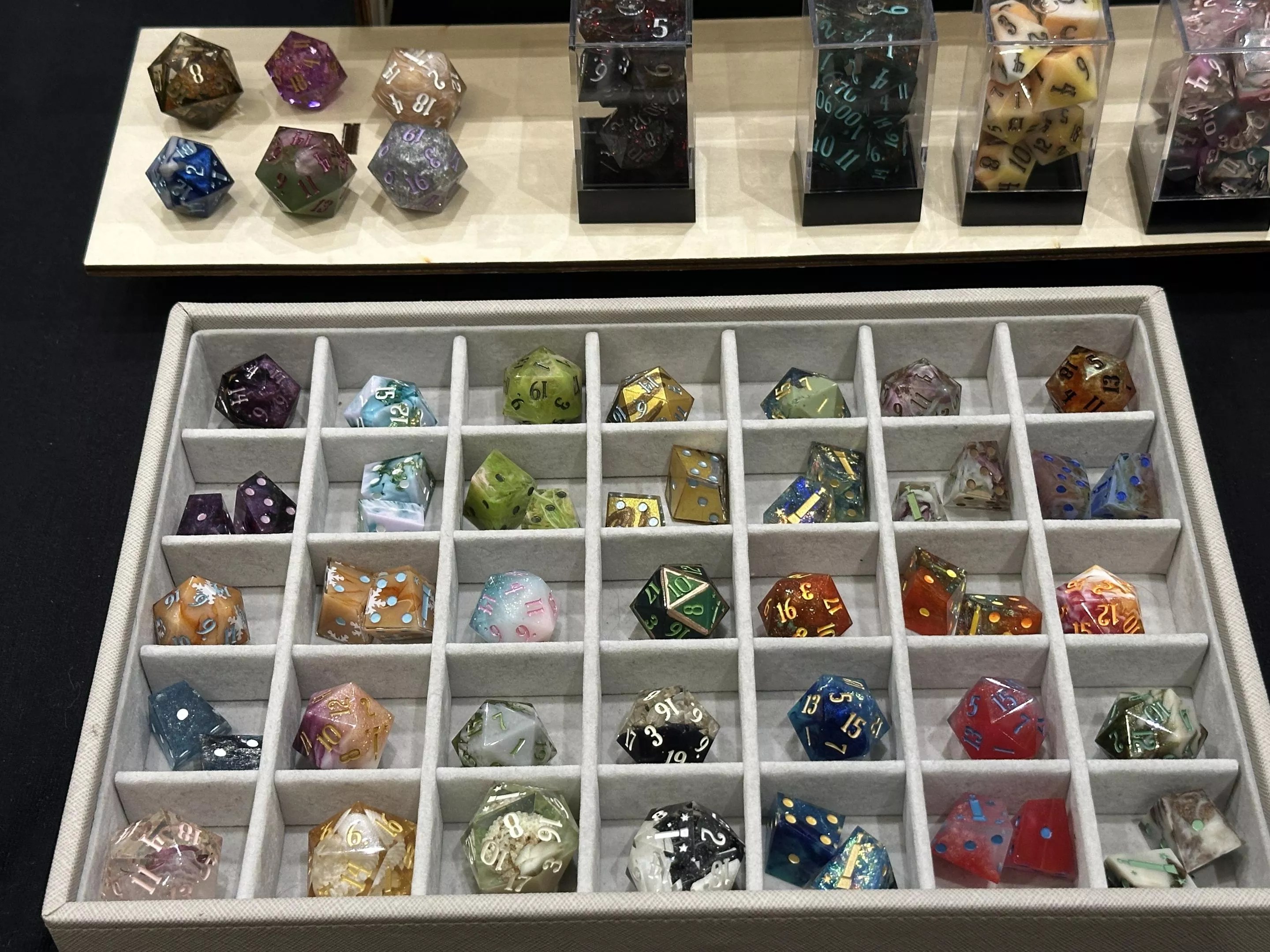 Yes, many — maybe most? — of the vendors at GenghisCon were selling dice or dice-related stuff, from dice jails to dice bags to dice prisons to the polyhedrals themselves, in any number of materials. Wood, stone, resin and more, in a complete and utter chaos of colors. Have a number range you need to randomize? There’s a die for that.