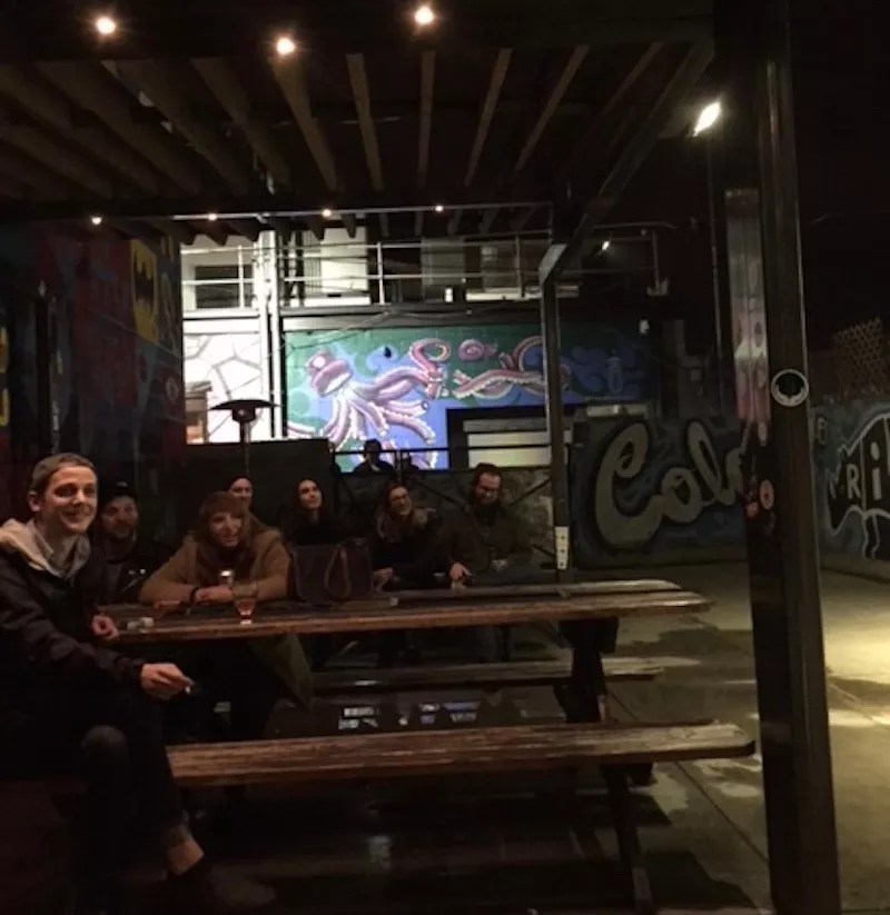 The room: The bar room at Matchbox is small and often crowded, with no dedicated area for a stage. The spacious back patio, however, seems tailor-made for comedic hijinks. Surrounded by colorful street art that adorns the alleys of the River North Art District, the patio offers ample seating at rows of benches and picnic tables, though many comics opt to stand and lurk. Outdoor comedy is always a dicey proposition, but Buchele’s revival of the Matchbox mic has been especially plagued by intemperate weather, a tradition that continued last Sunday. Indeed, after a day of moderate showers, most of the benches were still a bit damp and puddles had collected in low-lying corners. As a result, turnout was lower than expected, with roughly fifteen comics signed up to perform and just a small handful of drinkers willing to indulge them.