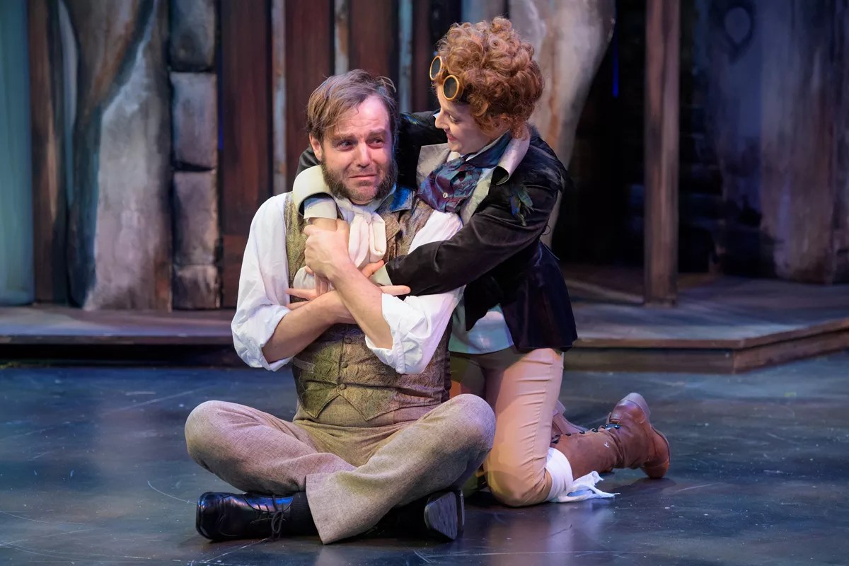 All of the acting is splendid: Emma Messenger is riveting as nasty, conniving Agatha, and Regina Fernandez’s perpetual smile as governess Emilie begins sweetly ingratiating moves through puzzlement and dawning understanding, and ultimately becomes so mean and secretive that it chills your blood. Then there’s Jessica Robblee’s Huldey: Give a highly talented actor a role with so many facets, where she can go from limited, flat statements to an outburst of song that mingles rock and ballad with a ruthless belt reminiscent of the murderesses in the musical Chicago, and you get one of those knockout performances that – almost alone -can make a critic’s life happy and worthwhile.