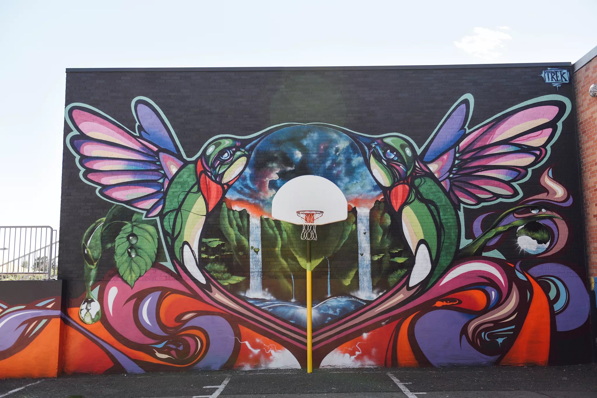 “These murals will help Cowell be the center of the community in a positive way. I want the murals pretty much everywhere,” says principal Shayley Levensalor. She hopes the murals not only increase community pride among families and students, but decrease vandalism in the area. A mural from Mexico City artist Paola Delf Photo courtesy of Lee Rains Thomas