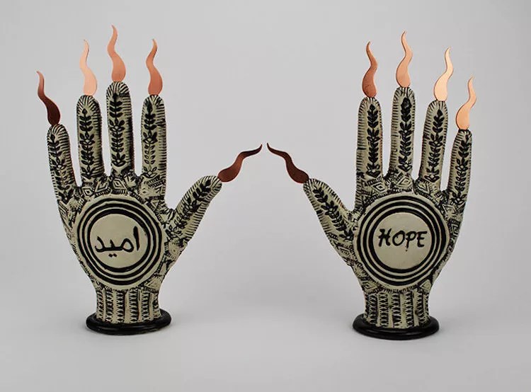 Plinth Gallery hosts a beautiful show of new work by ceramic artist Trudy Chiddix, who embellishes her folk-art-inspired hand series with metal flames and words of encouragement to pandemic first responders and hospital workers. Alongside the hands, Chiddix adds elaborately decorated vases in kimono forms with added fused-glass elements, as well as whirl-winding figures, standing disks and lamp-like works lit from within.