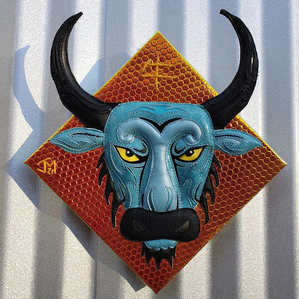 Jill Mustoffa, “Blue Year of the Ox,” hand cut and sewn vinyl fabric on wood panel.