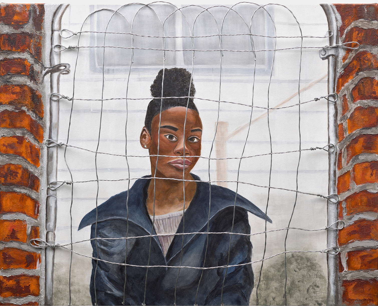 Carole Goodwin, “Fenced Out,” acrylic, charcoal and galvanized wire on canvas.