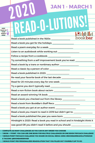 If you haven’t checked out BookBar’s Read-o-Lution yet, you owe it to your book-loving self to get in the mix and get ready for the big Read-o-Lution party on Sunday, March 1. Before that deadline, prep yourself by meeting the literary challenges set for you by the event – things like “read for at least twenty minutes a day for a full week,” or “read a classic by a person of color,” or “read a book published the year you were born.” You can pick up your Read-o-Lution challenge card at BookBar, or download it on the shop’s website. See you March 1!
