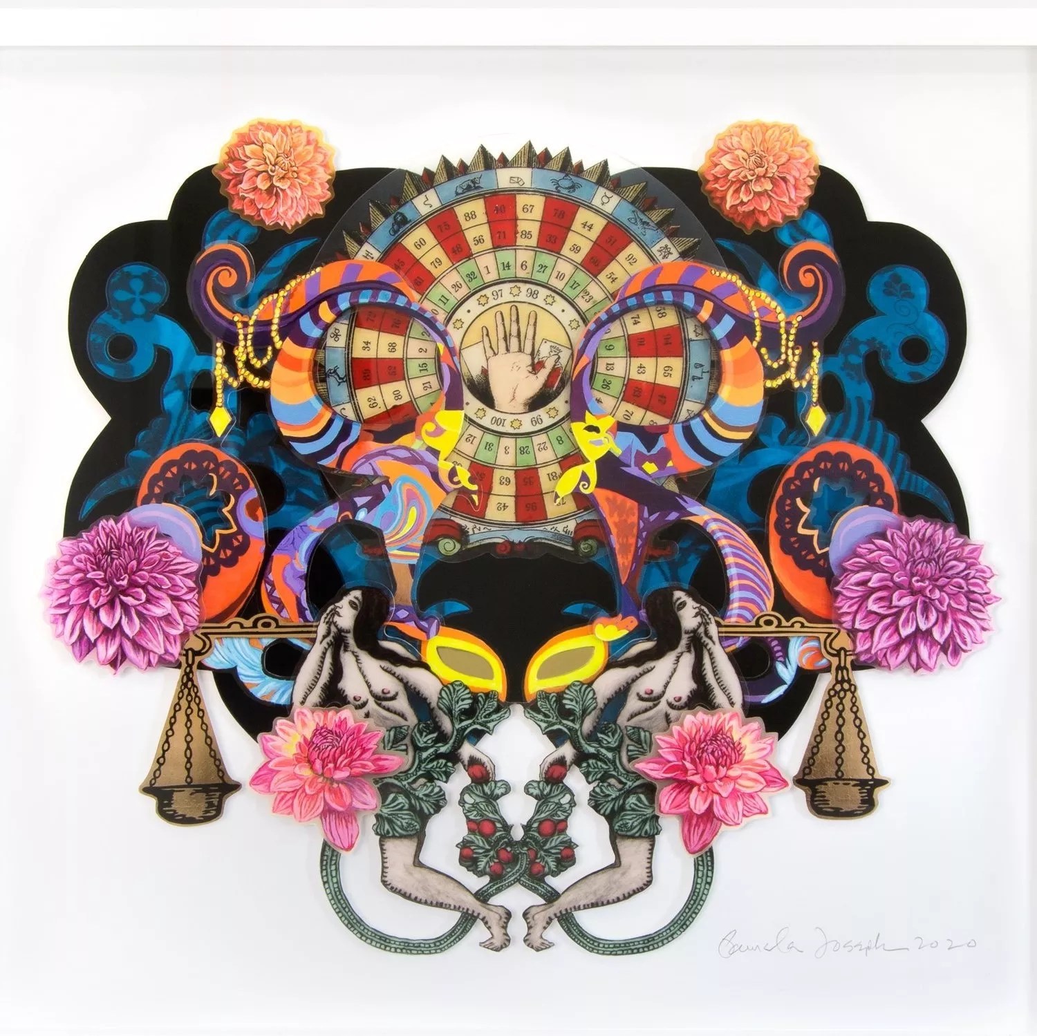 Pamela Joseph, ”One cannot legislate love, but what one can do is legislate fairness and justice,” mask headdress, 2019, acrylic and mixed media on plexiglass. (Title from a poem by Maya Angelou.)