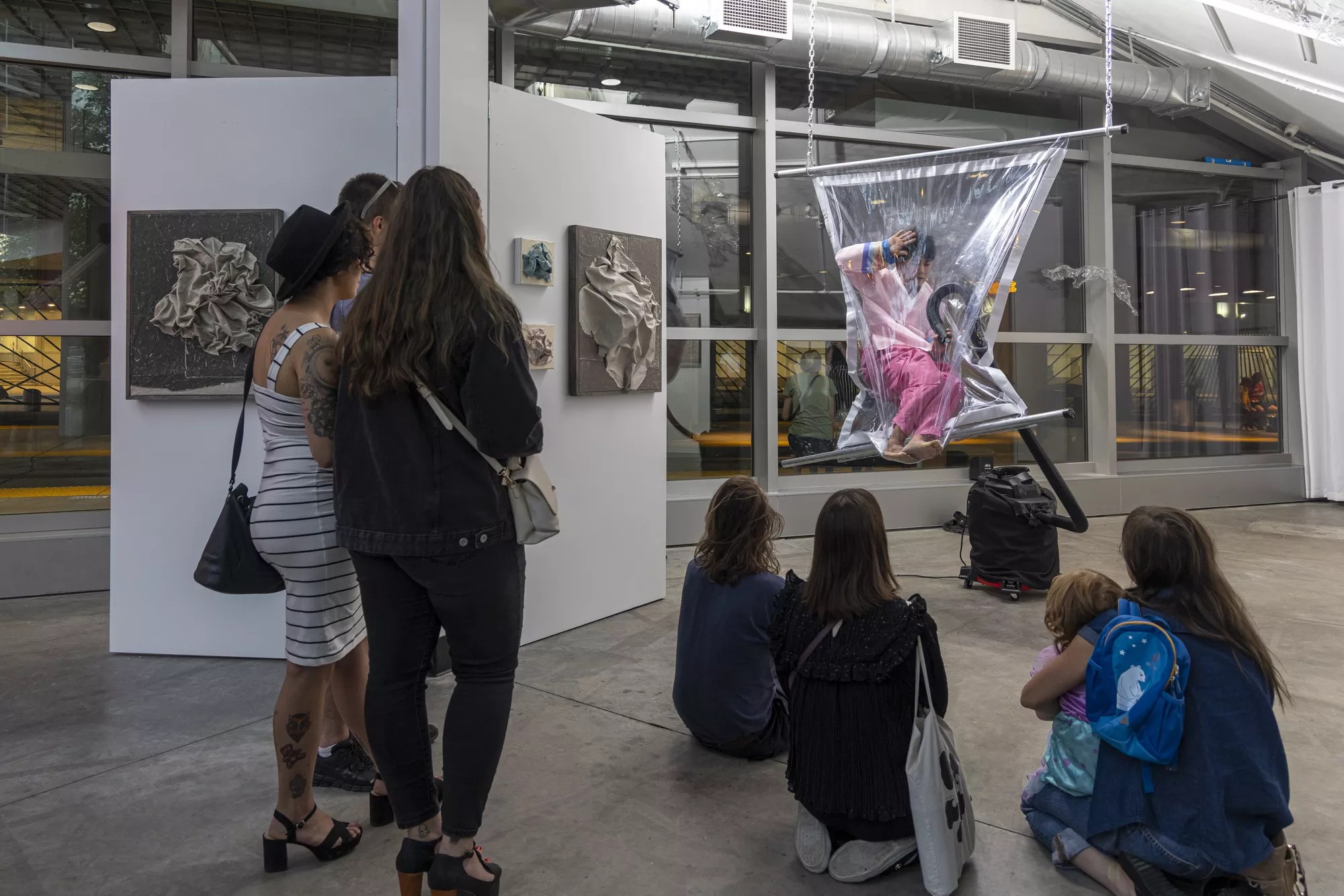 As Su Kaiden Cho’s show and performance Numinous draws to an end at Understudy, you have one more chance to see the artist vacuum-seal himself in a vinyl bag hanging from the ceiling. Do not try this at home.