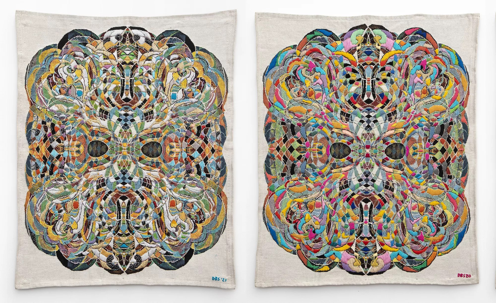 David B. Smith, “Mask 1,” 2020, and “Mask 2,” 2021, embroidery on artist-designed tapestry, wood backing.