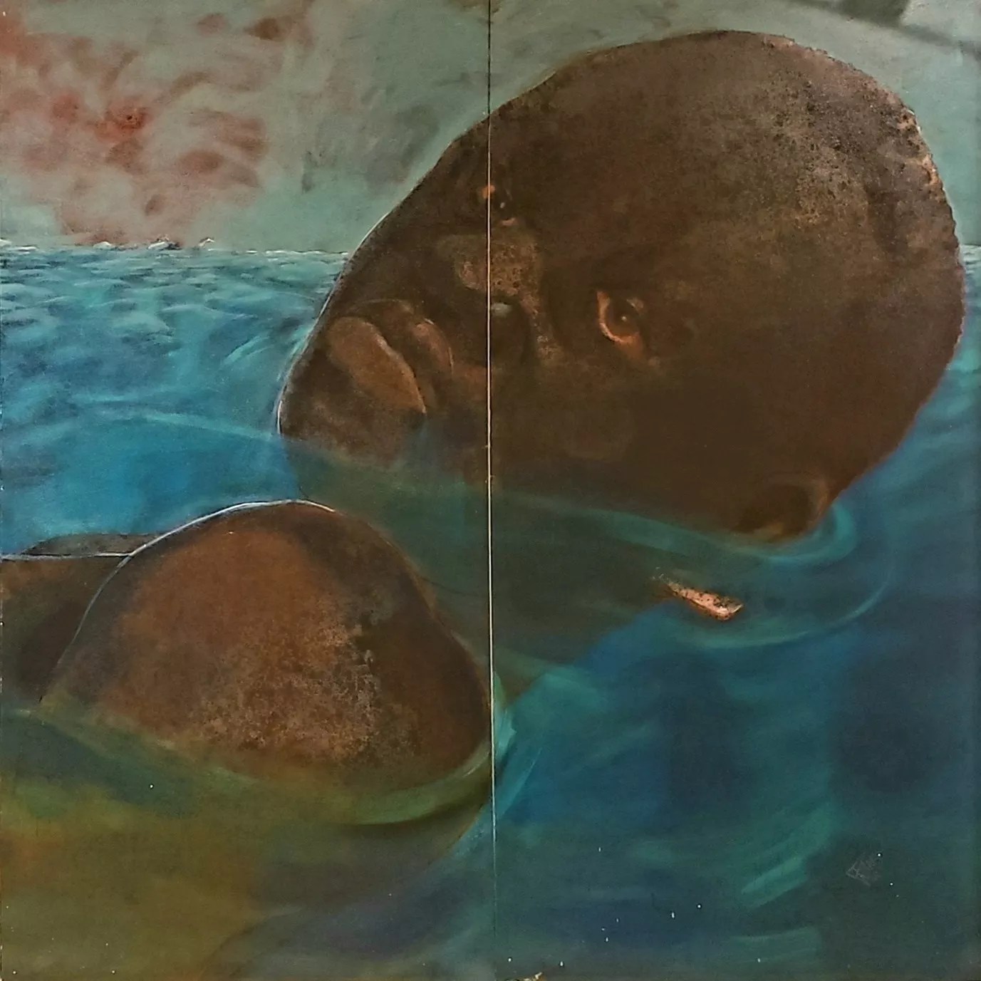 Detail of large oil painting by Floyd Tunson, “Adrift.”
