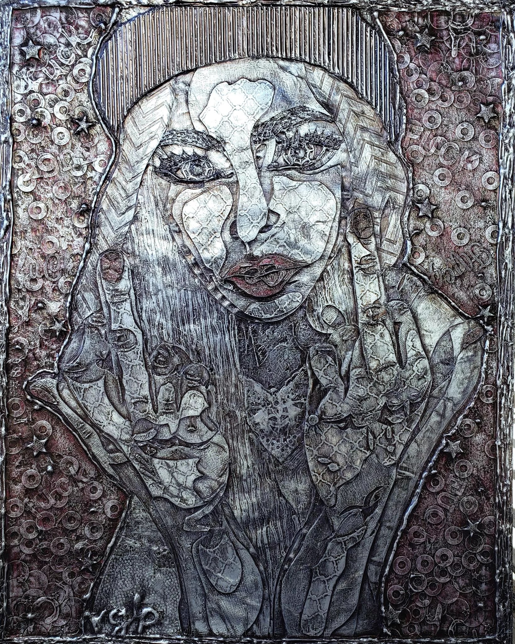 Lori Ruiz, “The Offering,” mixed media on wood panel.