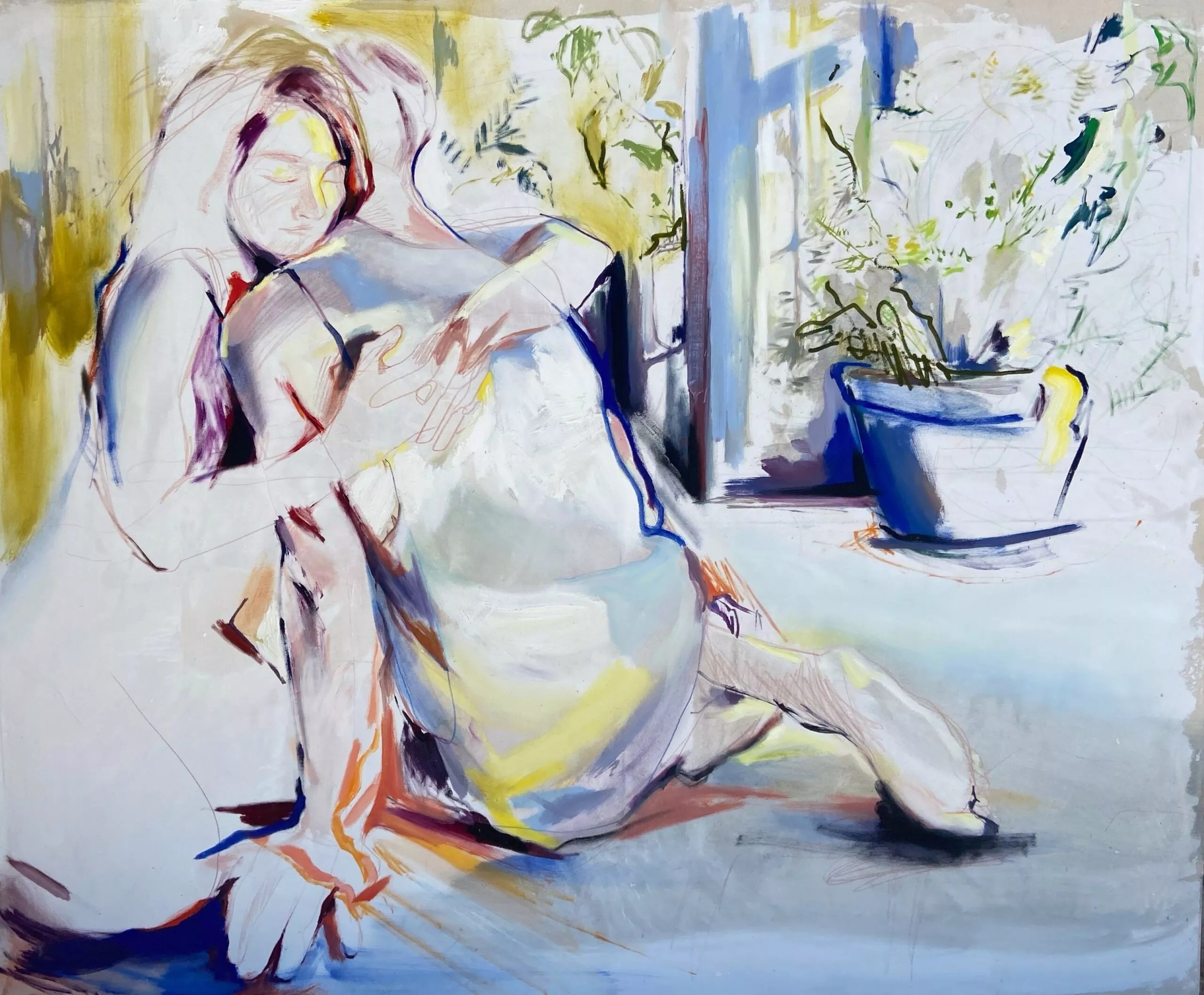 Kaitlyn Tucek, “Whitney and Mateo,” 2021, oil, crayon and colored pencil on canvas.