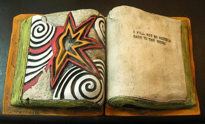 Lies A ceramic book by Edge Gallery artist Gayla Lemke. Gayla Lemke