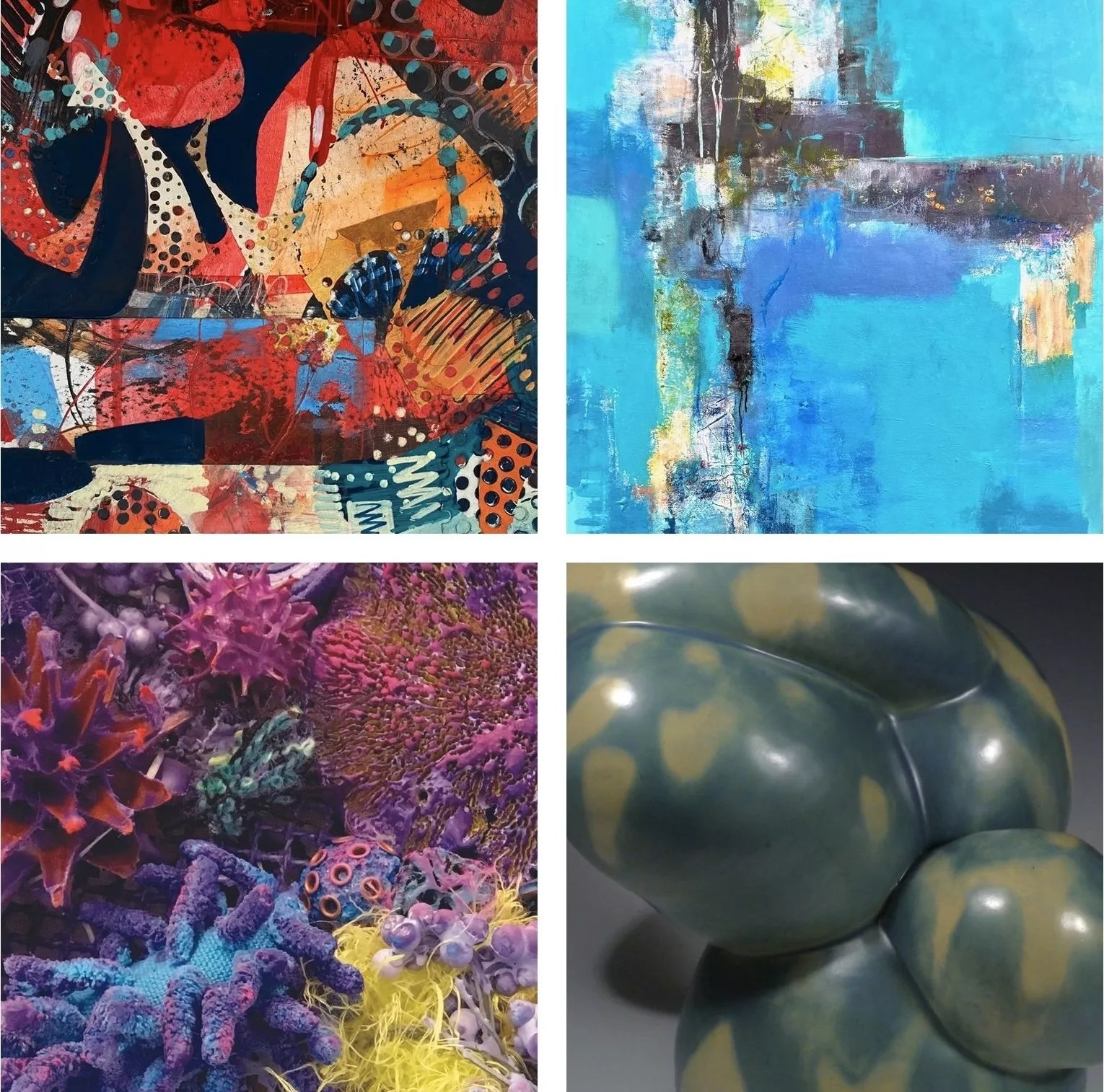 Detail images: L to R, upper: Emily Oldak, “Swing Time.†Laura Brenton, “Elemental.†L to R, lower: Sandi Miot, “Purple Corals.†Vicky Smith, “Dappled Light.â€