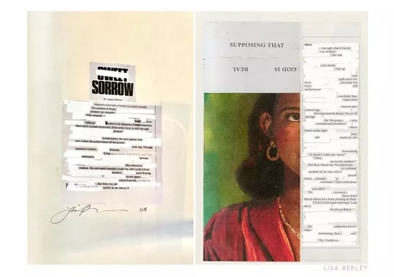 A page from Lisa Berley’s erasure poetry and collage series.