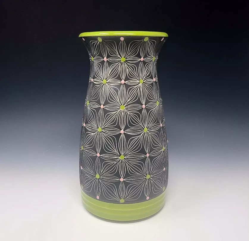 Mark Conlon, wheel-thrown porcelain vase with hand-carved pattern and green glazed interior with bare porcelain exterior, and green and pink dots.