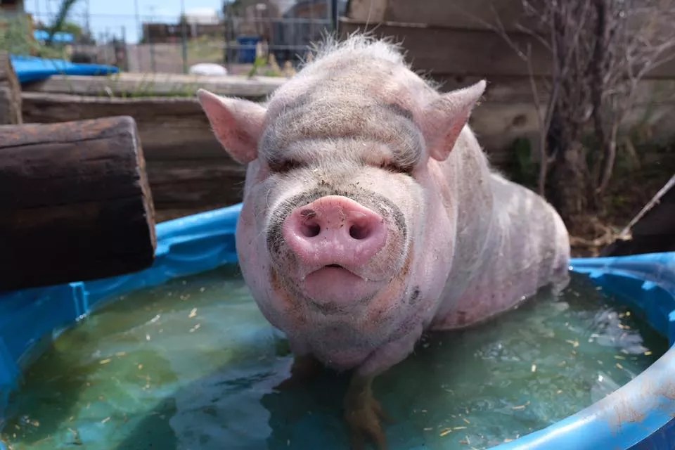 Cheese for the camera with a rescued pig at Resolute Brewing.