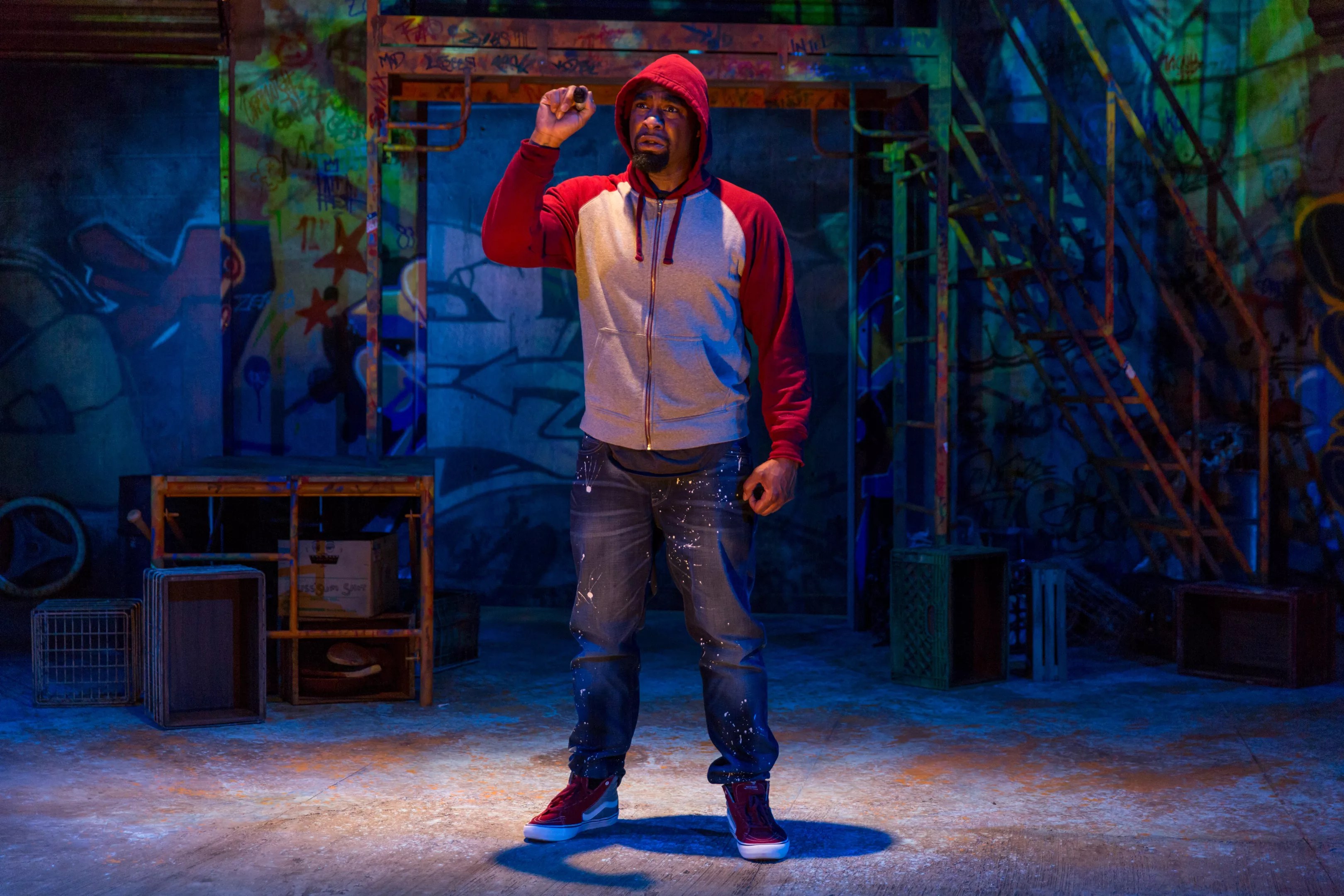 Fortunately, the Off-Center actors are all lively and charming enough to carry the audience with them, and the set, with its swirling images and noisily banging garage doors, is very effective. The plotting starts to gather energy, too, as the three artists plan their major art-institute piece. When Seven addresses the audience directly, making us his co-conspirators, anticipation runs through the theater. We’re about to be exposed – symbolically, at least – to the risks real graffiti artists face. How will Seven, Dose and Jose Clemente pull it off? Will they hand us spray cans? Invite us to brainstorm ideas or actually create some work? Unfortunately, nothing like that happens, and we’re soon back to being mere observers.