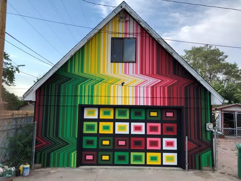 Artist Anthony Garcia Sr. decorated a Swansea garage in his signature serape-stripe style for This Machine Has a Soul.