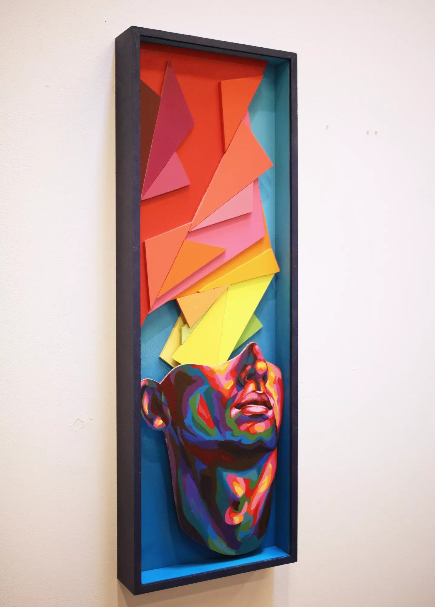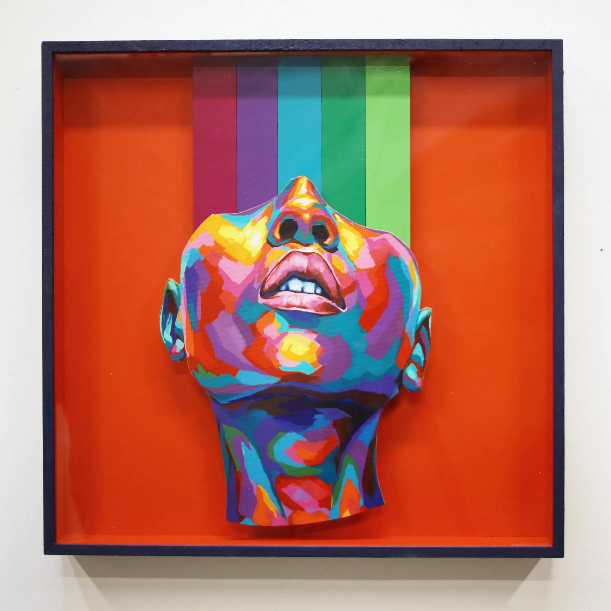 The goal is “to make it feel like this piece is made for this space,” Detour said last Thursday, looking at a wall crisscrossed with blue tape; he planned to coat the walls in colors that would complement the pieces hung on them. The art in question, housed in frames he handcrafted in the RedLine wood shop, boasts bold colors and sharp geometric lines. But the first things the eye darts to in these pieces are the lower halves of faces, painted on cardboard in a myriad of hues. These cardboard partial portraits began as a side activity as he worked on a separate, time-consuming project, says Detour, and then burgeoned into a full-blown motif. He’s drawn to these half-faces because missing the subject’s eyes gives the work a kind of anonymity, a space for viewers to invent a story, even though many of the faces actually come from reference images of friends.