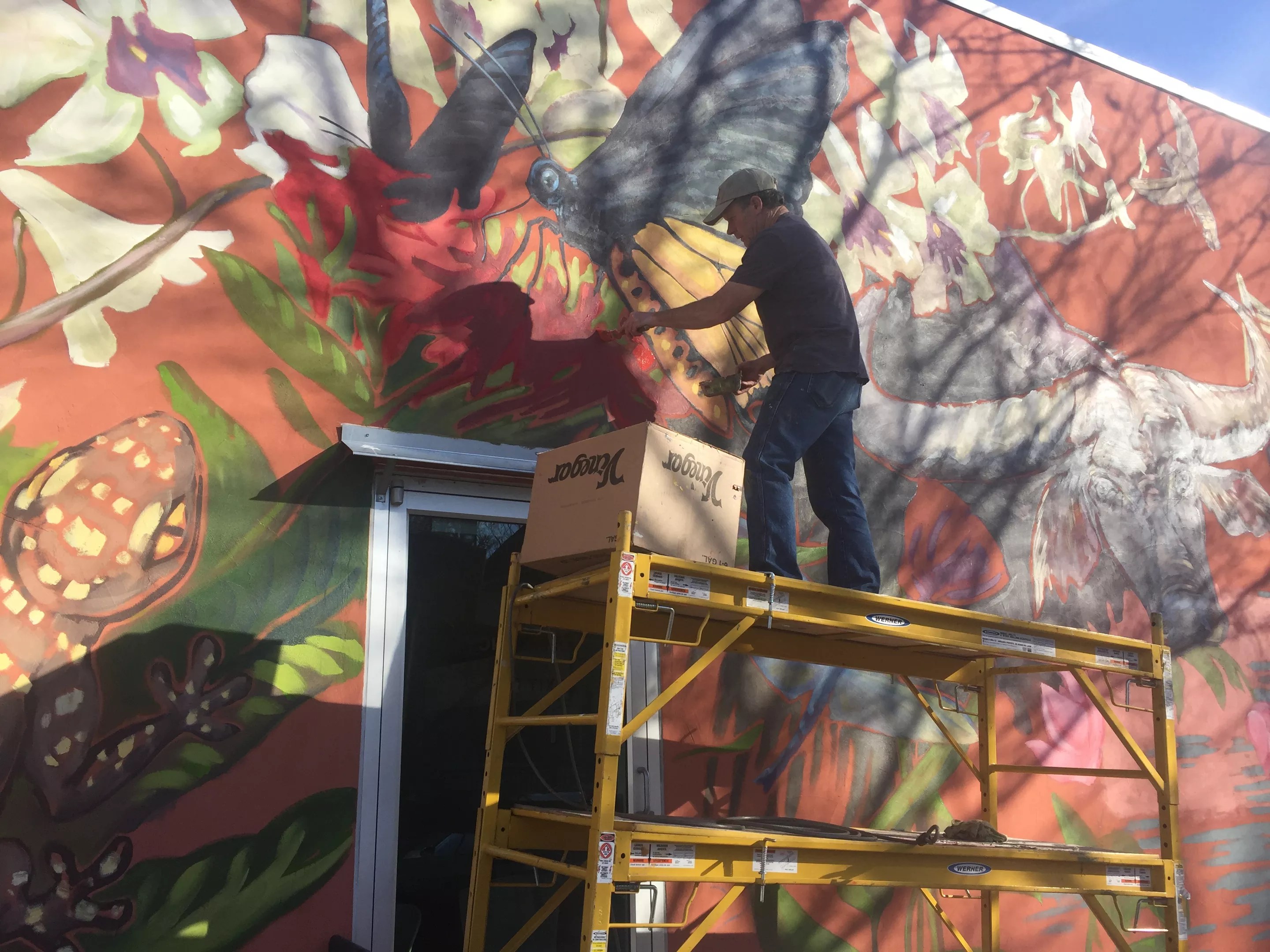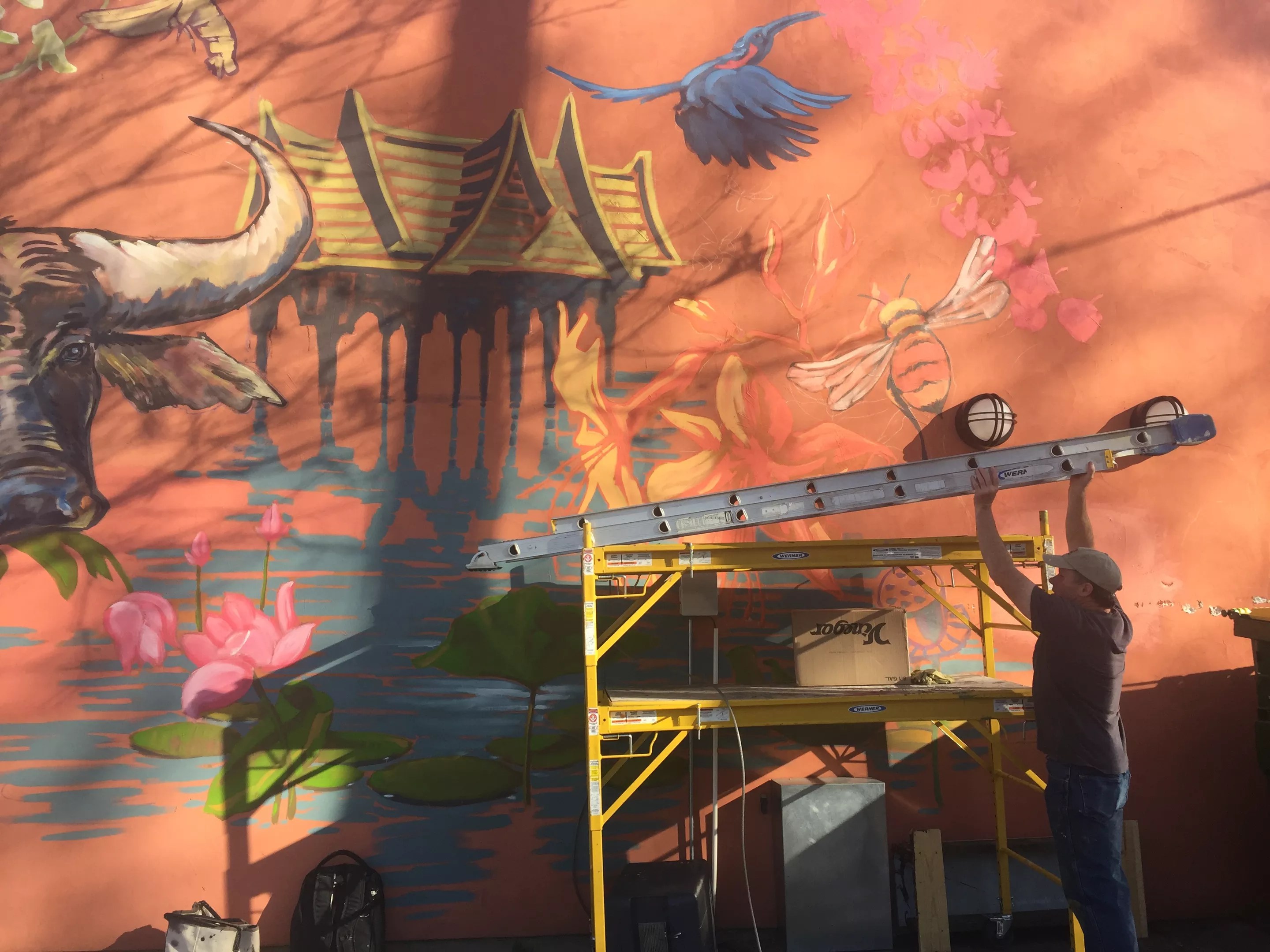 The Thai rainforest scene he paints is a lush, vivid breath of life. A water buffalo looks at the viewer with soft, well-deep eyes; a gecko, birds, flowers and a number of insects buzz across the wall. Ward has an affinity for insects and has focused on them in this piece; he’s concerned about the plight of pollinators in the world.