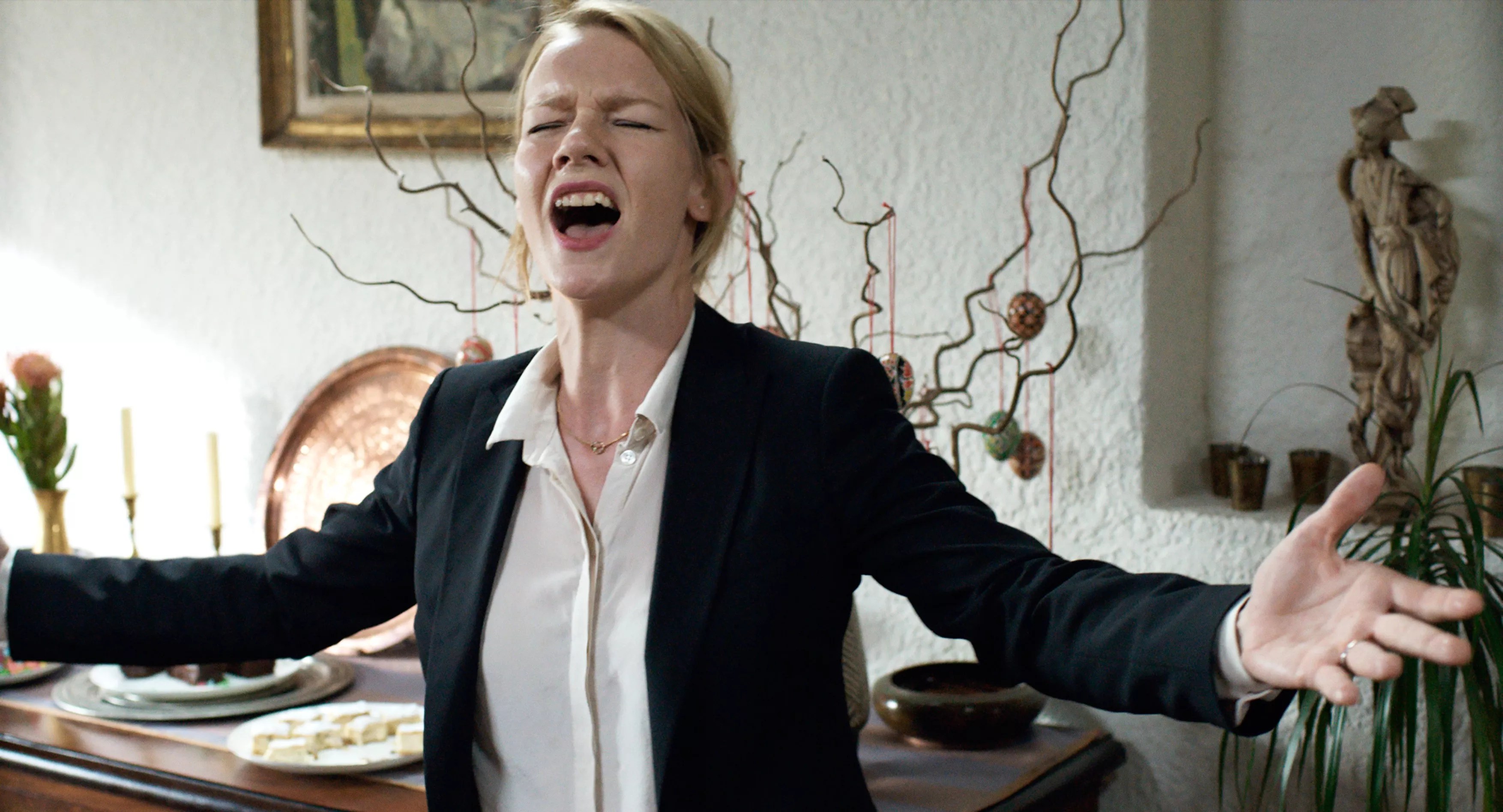 Winfried, it seems, is always clowning – and just as often annoying those he hopes to delight. His antics, like wearing ghoulish makeup, work best on his pupils, grade-school kids who, perhaps out of deference to or love for their kooky teacher, have also slathered themselves with similar KISS-type maquillage. But the big guy keeps the face paint on even when paying a visit to his wizened mother – who shoots him uncomprehending, hostile and increasingly hilarious looks – and when arriving at his ex-wife’s house for a party to celebrate the fact that their only child, Ines (Sandra Hüller), a careerist corporate strategist currently based in Bucharest, is back home in Germany for a few days.