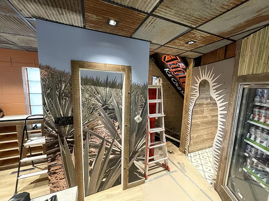 For the interior walls, Beall pulled an image of San Luis del RÃo’s agave fields in Oaxaca taken by multimedia journalist Tony White, then utilized the skills he had perfected while working at the museum to scale the image to size before applying it to the wall as a vinyl wrap. “When you first come in, the work was done to have the rustic ceiling and the bamboo, and to give you the feeling like you’re at a palenque in Oaxaca, Mexico,” Beall explains.