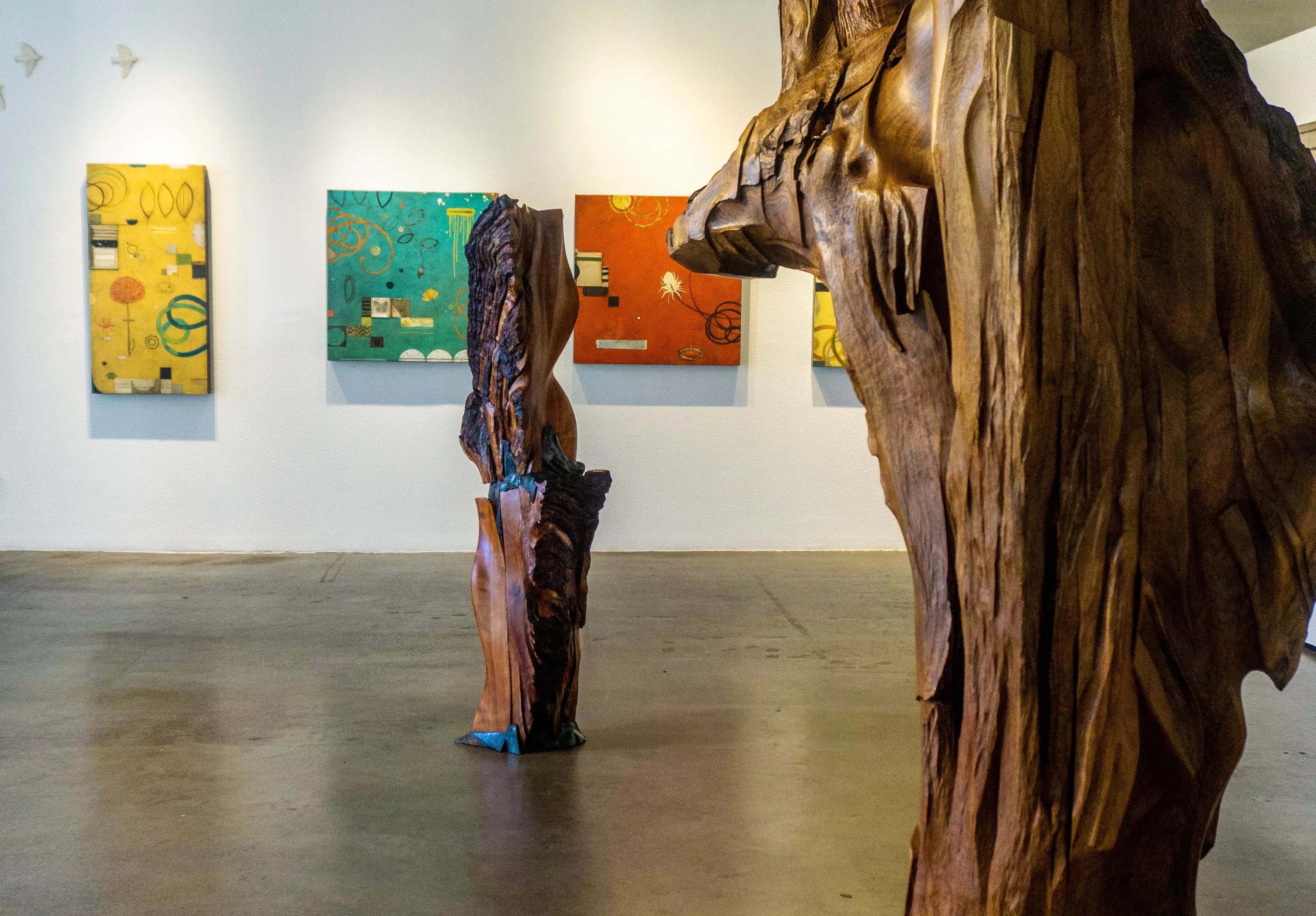 Most of the other artists in Enchanted Garden embrace flowers in some way. But a major component of the show, unifying the whole thing, is decidedly non-floral: monumental floor sculptures by Norman Epp. Taking the form of fluid spires in carved wood accented by metal, they convert the space into one big forest.