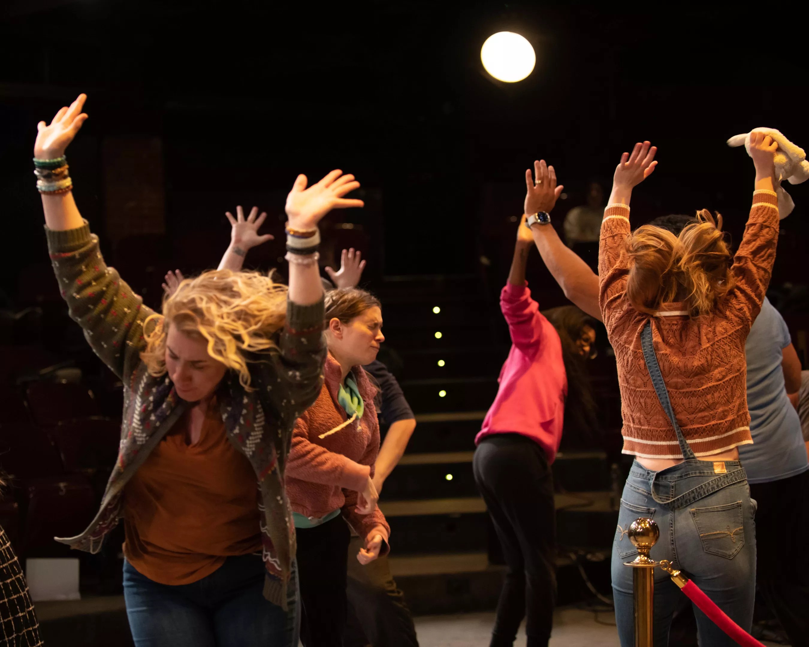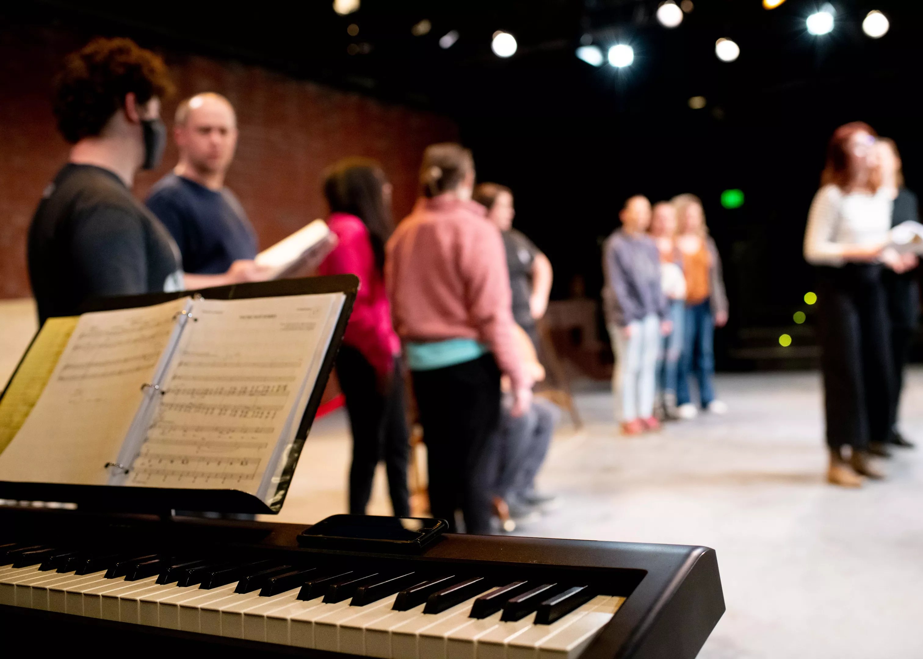Music director Dan Graeber notes that the score is “incredibly intentional,” and he is doing his best to honor every detail. With almost every song showcasing the ensemble singing intricate harmonies, Graeber had his work cut out for him. “I spent two weeks before the first rehearsal going line by line through the script and score, using multiple spreadsheets to map out every cast member’s track through the show,” Graeber shares. “We were blessed to be able to put together a really killin’ cast of singers, and I spent a lot of time with each song, carefully matching the different voices to the written harmonies — kind of like painting musically, with sixteen different vocal colors. It was exciting to hear that work come to life in the room. And I’ve really appreciated how committed this cast has been to working at a high level of detail, which this score demands.”