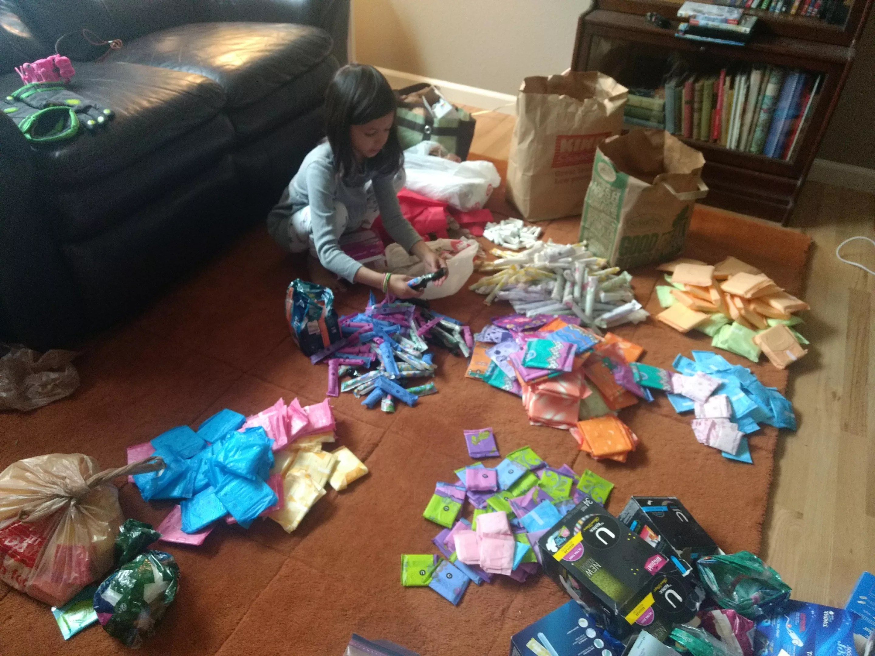 Counting tampons and maxi pads for the homeless and impoverished women that I Support the Girls works with is a great way for a kid to help out.