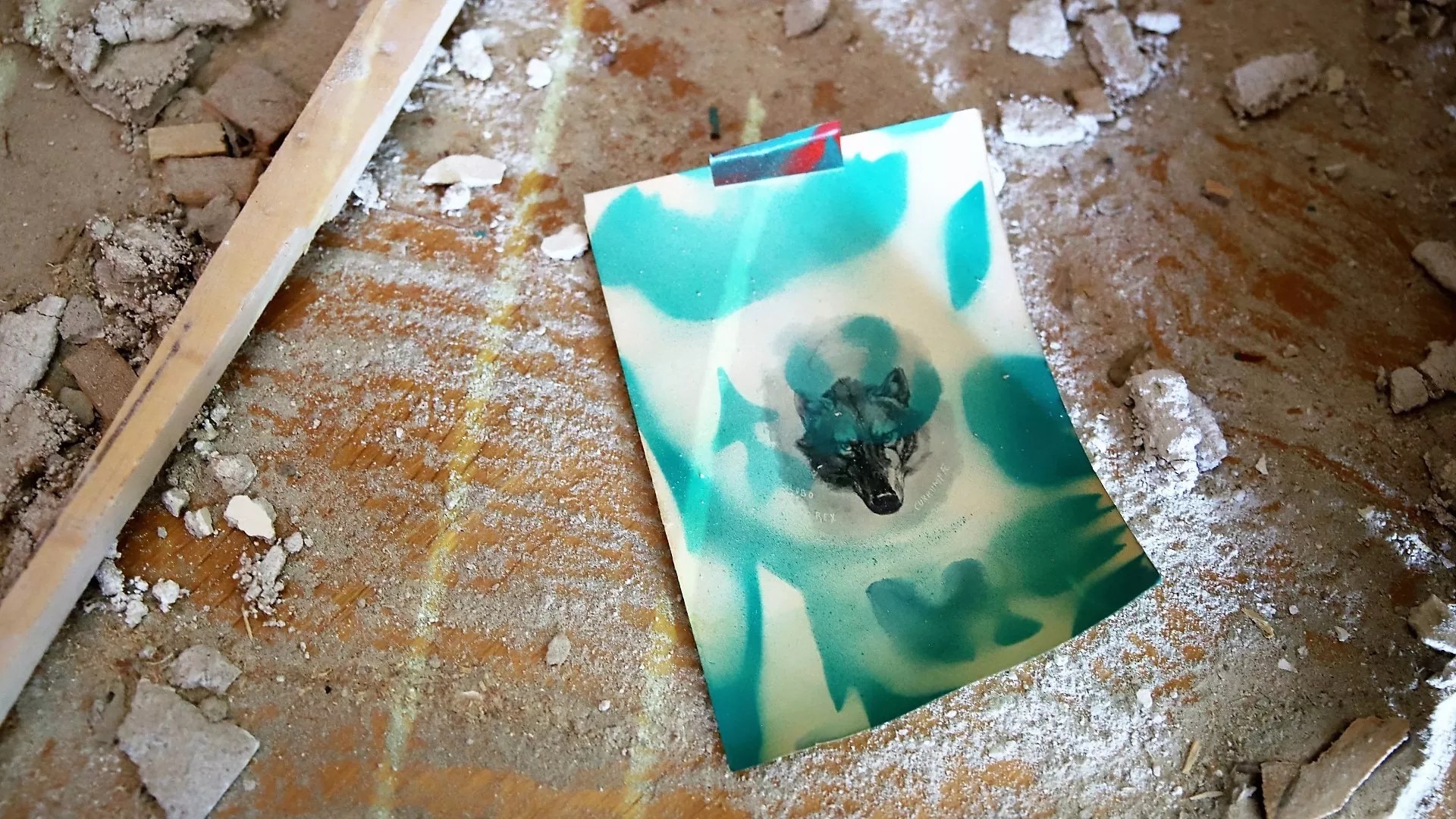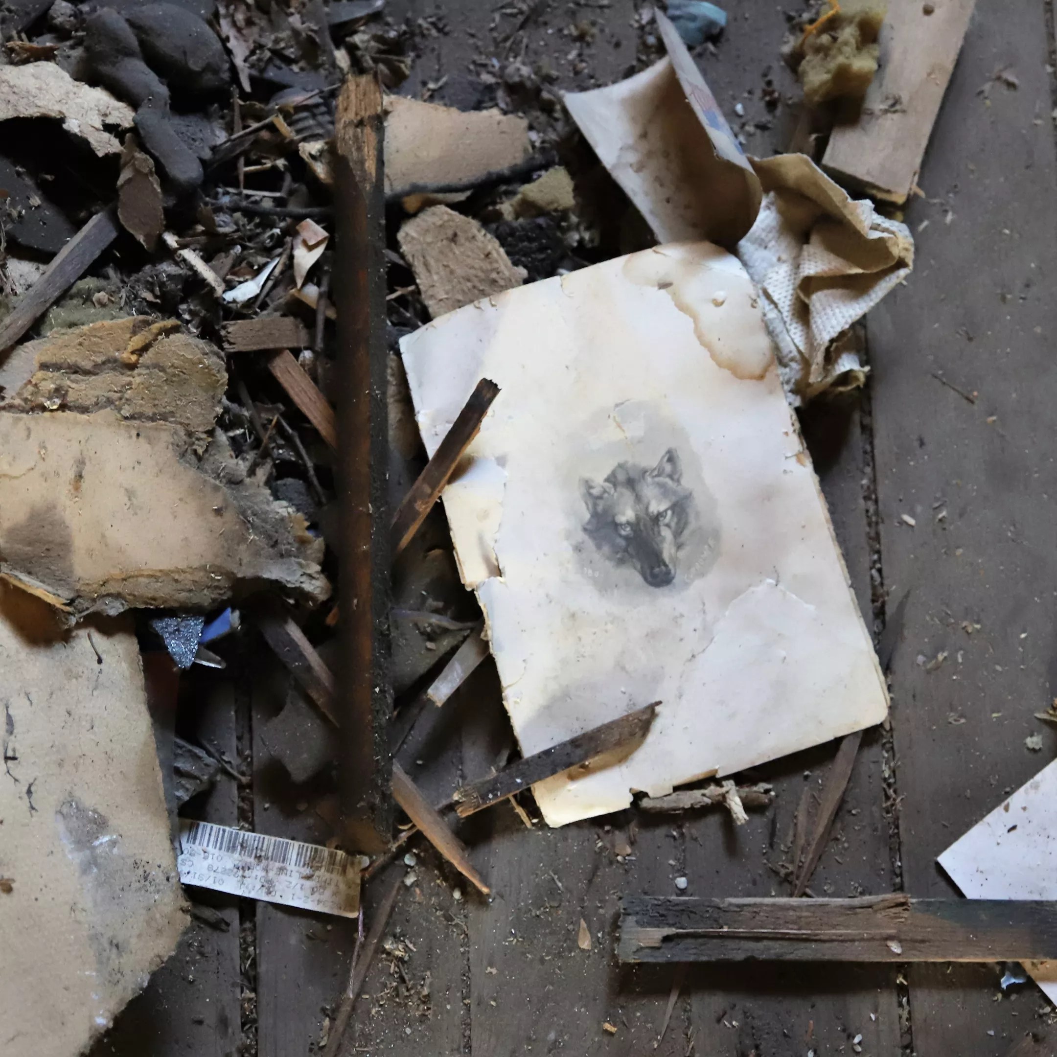 Discovering Seton’s story intersected with Feniak and Friedman’s ideas about the rewilding of architecture – already well demonstrated by growing vines that had taken over the interior of the Hut and wild grasses thriving outside on the lot. The duo collaborated with fellow artist Eileen Roscina to shoot dreamy film footage throughout the house, adding projections to their interventions inside and outside. They brought a live white wolf, Simba, to wander silently through the Hut’s moldering rooms. They gathered fragments of wallpaper and wheat-pasted them to the walls, always documenting their footsteps.