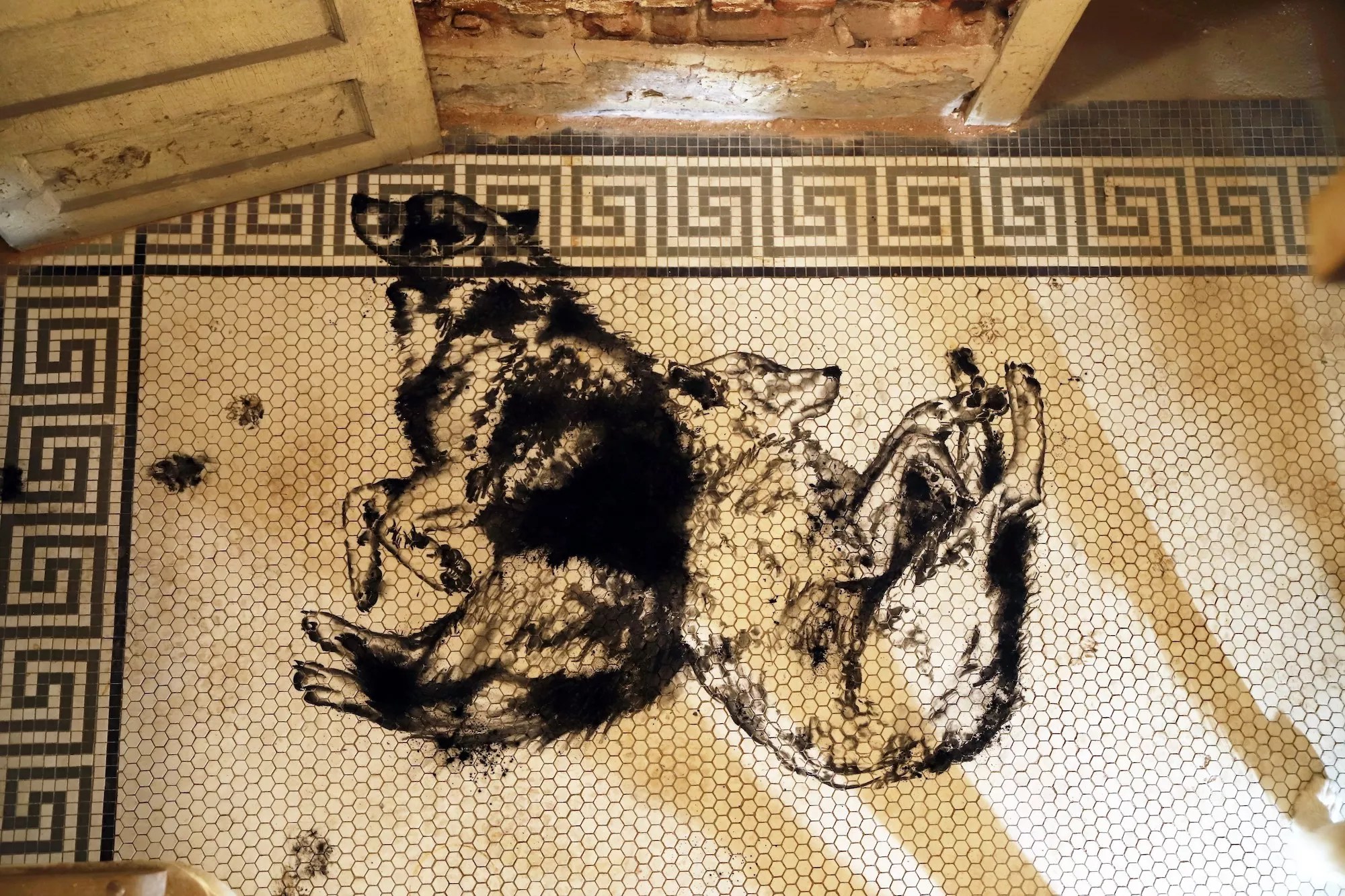 As the Hut’s demolition date drew near, they made a true-to-scale rubbing of a handcrafted tile floor they had admired in the basement and overlaid it with a life-sized charcoal drawing of Lobo and Blanca before destroying the floor in a performative ceremony that included trauma-releasing somatic dance. The resulting multimedia montage will become an important element of the installation: “We’re wheat-pasting it on the floor in the gallery’s entryway, so it will get destroyed all over again,” Friedman explains. “I can hardly wait to see if people will step on it.”