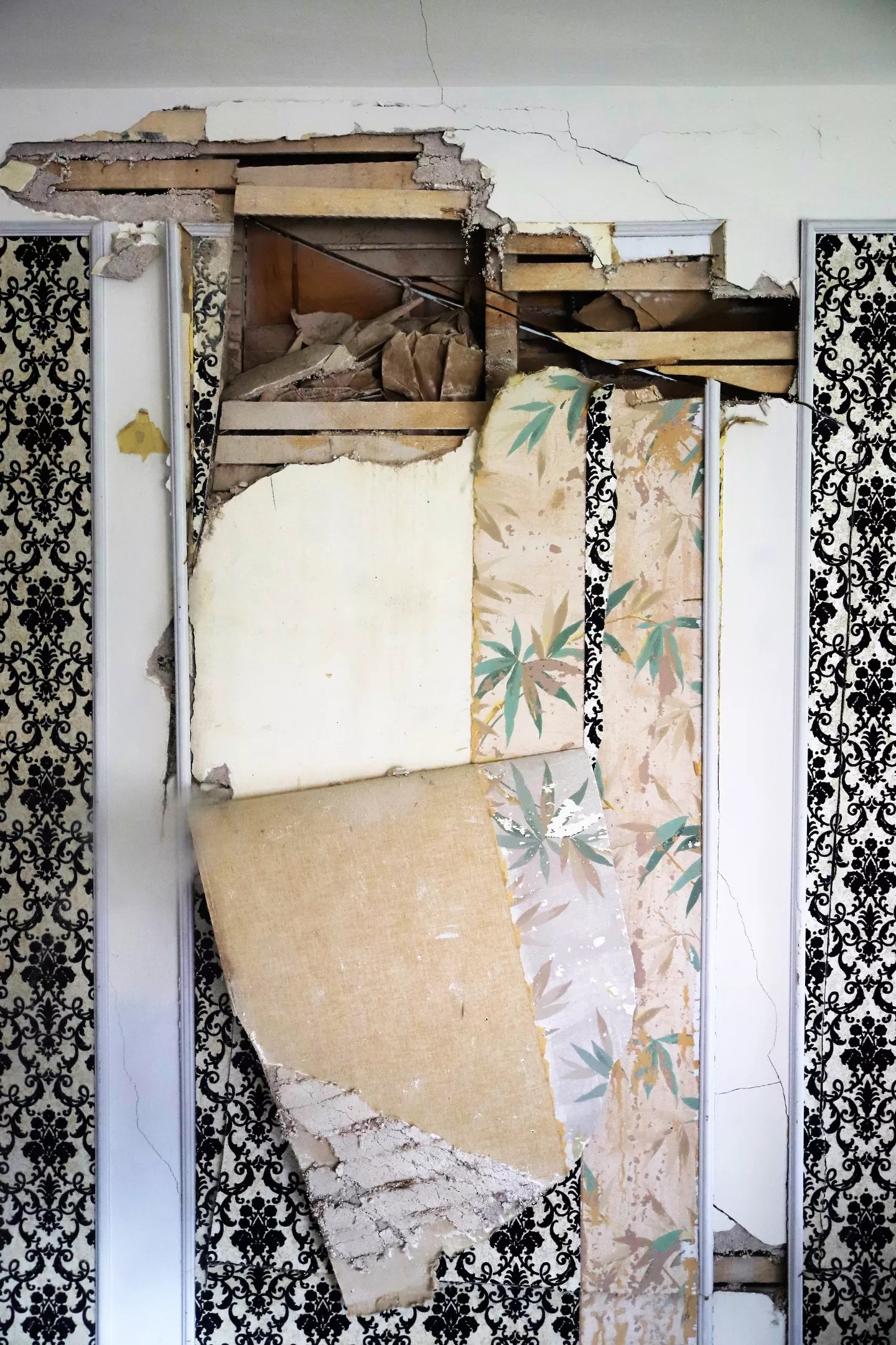 As they delved into the Hut’s ruined innards, they found more than enough material to work with. Over the years, the house had suffered shoddy additions, flooding, fires and burst pipes. Friedman and Feniak found layer upon layer of wallpaper, fragments of doors and flooring strata, a closet that led from one room to another. They uncovered a whole apartment in the basement, and hand-laid, un-grouted tile flooring attached to a foot-deep layer of concrete.