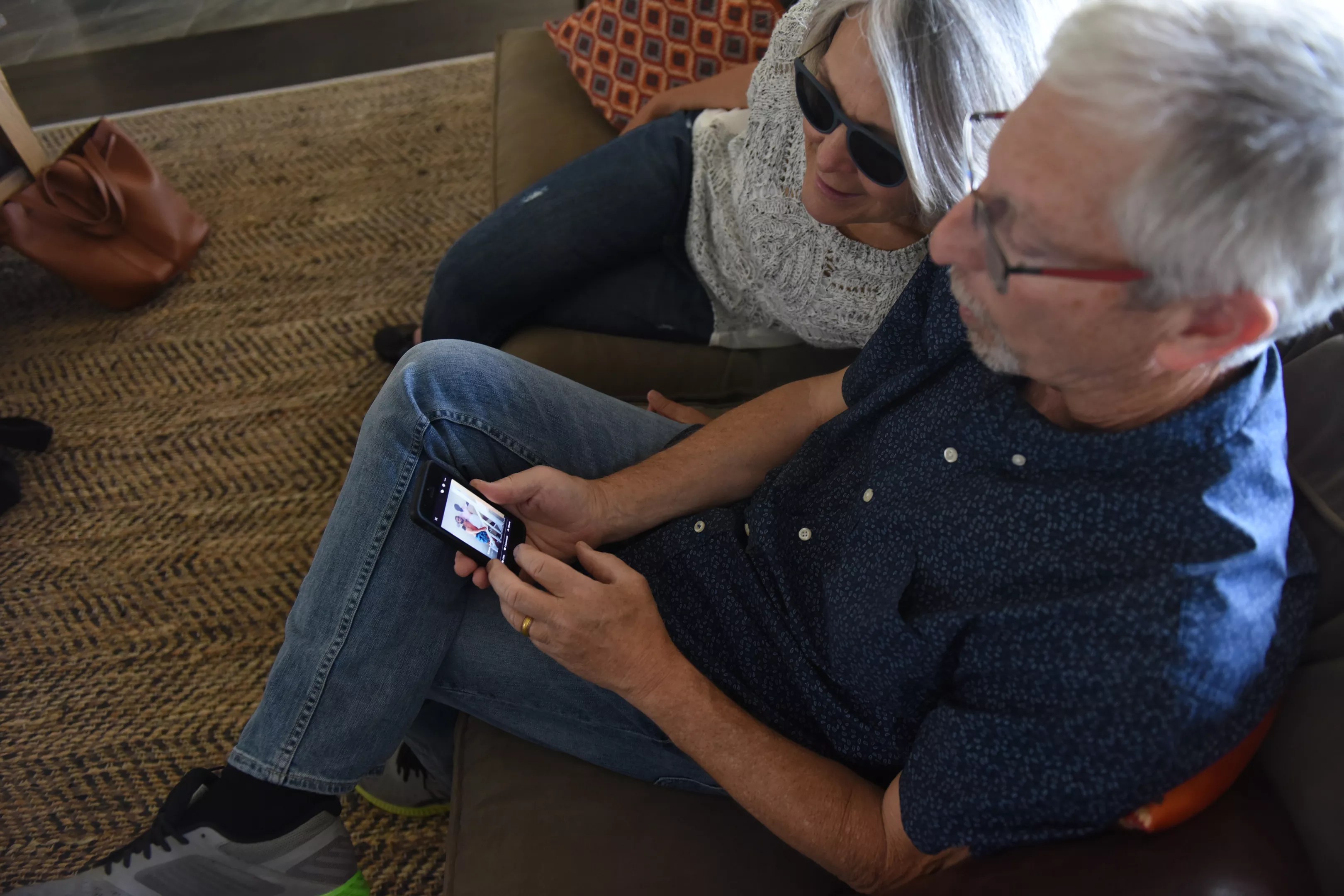 Steve and Kathleen look at the photo Steve used to respond to the personal ad; he uploaded it to Facebook a few years ago.