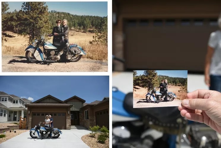 Top left: Kathleen and Steve Jaben with his 1946 Indian Chief motorcycle Colorado in 1989. Bottom: The Jabens with the same motorcycle in Colorado in 2017.