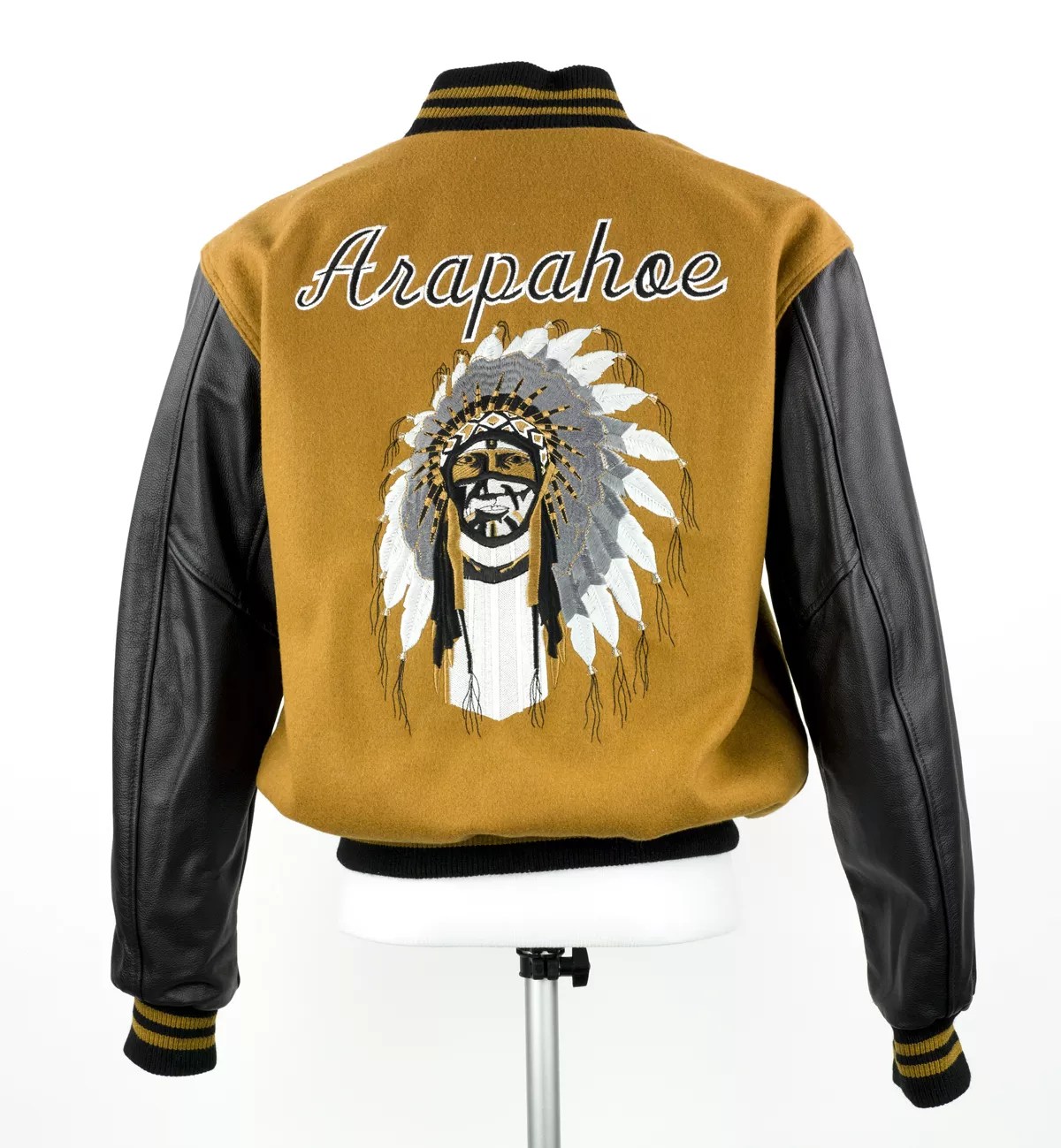 The logo of a 2006 Arapahoe High School letter jacket echoes the image on a Cheyenne shield.