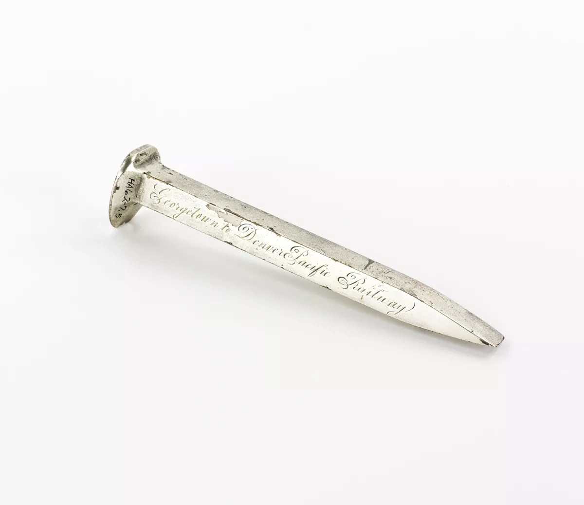 Denver residents who followed the Ink! Coffee gentrification flap should take a look at the Denver City Market Bell, which once rang out over the area of Five Points close to the Platte where Colorado farmers gathered to sell their produce. The residential part of the neighborhood was centered on Welton Street, which was bustling with African-American-owned businesses a century ago. In Zoom In, Denver’s black population is represented by former slave Florence Bell’s crazy quilt from 1893, the sneakers that Wellington Webb wore on his way to becoming mayor in 1991, the Shriner hat that Leroy Smith wore in the 1940s. But in one of the exhibit’s major omissions, there’s no corresponding hood to represent the broad influence of the Ku Klux Klan in Denver in the ’20s. Five-term mayor Benjamin Stapleton was a member of the Klan; that chapter of his résumé is far less known than his role in creating Denver’s first airport. Ceremonial silver railroad spike (1870) Courtesy History Colorado Center