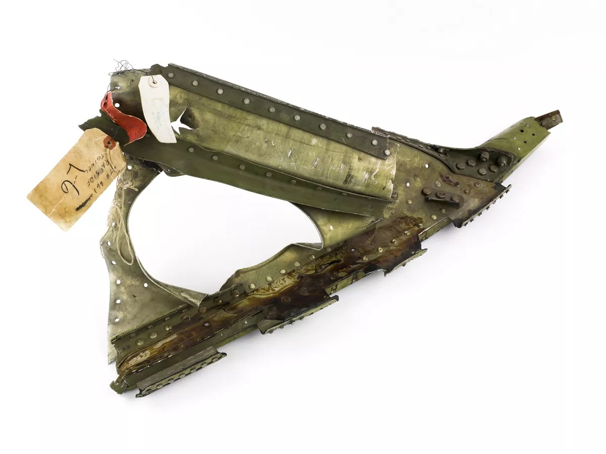 Denver newcomers are also unlikely to recognize that if history had taken another turn, they might have moved to Cheyenne rather than the Mile High City. Object 32 is a ceremonial silver spike that commemorates the day in 1870 when the Denver Pacific, a hundred-mile line funded by Denver boosters, linked this city with Cheyenne, which the Union Pacific had preferred for an overland route. That move paved the way for Denver to become the rail hub of the Rockies (and for the renovated Union Station to become a hub for Denver nightlife three years ago). Eight decades later, President Dwight Eisenhower (represented here by his WWII jacket), whose wife, Mamie, was a Denver native, pushed the interstate system that sent I-70 right through Denver; today, expansion of that highway has created another fractious chapter in Colorado history. United Airlines Flight 629 airplane fragment (1955) Courtesy History Colorado Center